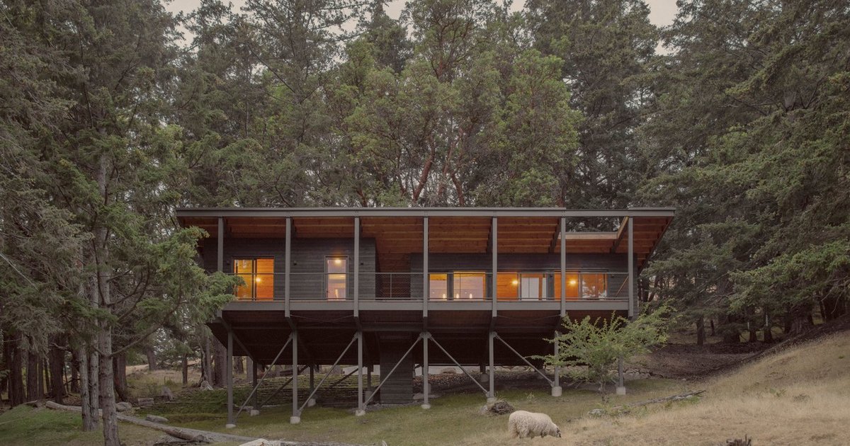 Positioned about 70 miles north of Seattle, the cabin sits at the edge of a mature fir and madrone forest, overlooking the expansive views of the San Juan Islands. The steep natural terrain and restricted site access shaped a design strategy that prioritizes preservation of the land. Instead of excavation or heavy ground disturbance, the architects developed a concept of elevated living, allowing the forest floor to return to native vegetation and wildlife activity. Wild sheep and deer continue to graze beneath the structure, reinforcing its minimal ecological footprint.