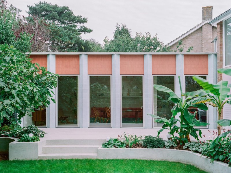 The garden elevation is deliberately more ornamental than the restrained side and rear façades, echoing the tradition of civic architecture where public-facing elements carry greater expression. Off-the-shelf blue pigmented blocks were cut on site to form deep triangular columns, punctuated by inset terracotta tiles that reference the arrowhead tiles of the original 1950s house. This triangular motif becomes a unifying design language, appearing in the plot geometry, entrance canopy, structural details, and even the patterning of the original mid-century wallpaper.