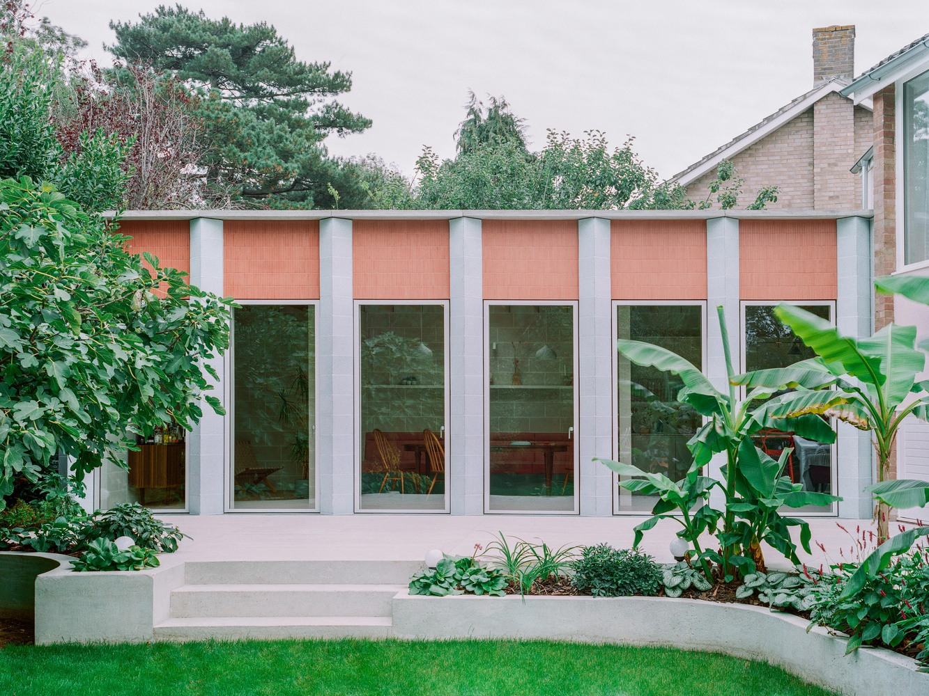 A vibrant triangular extension reimagines a 1950s home with bold color, efficient materials, flowing interiors, and garden-focused living in Epsom.
