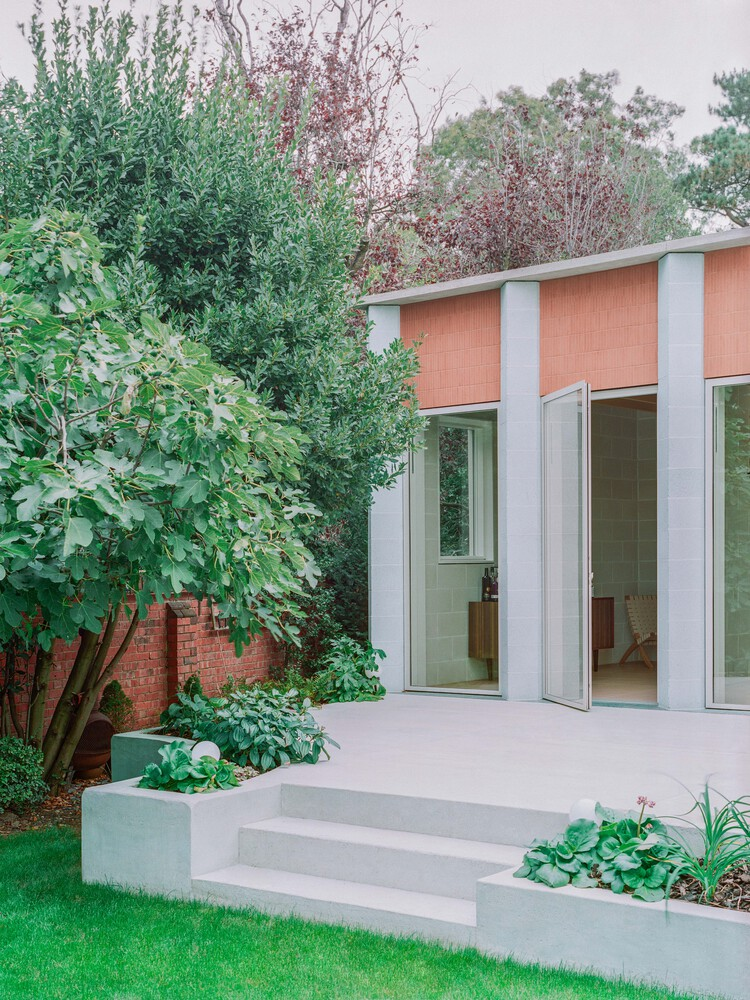 The new garden-facing wing is united with the original house by a sweeping blue terrace, animated by an exotic planting scheme designed by Phenomena. Banana palms and lush foliage soften the geometry of the architecture, creating a layered transition between built form and landscape. This outdoor sequence enhances biodiversity while reinforcing the home’s visual connection to Roseberry Park.