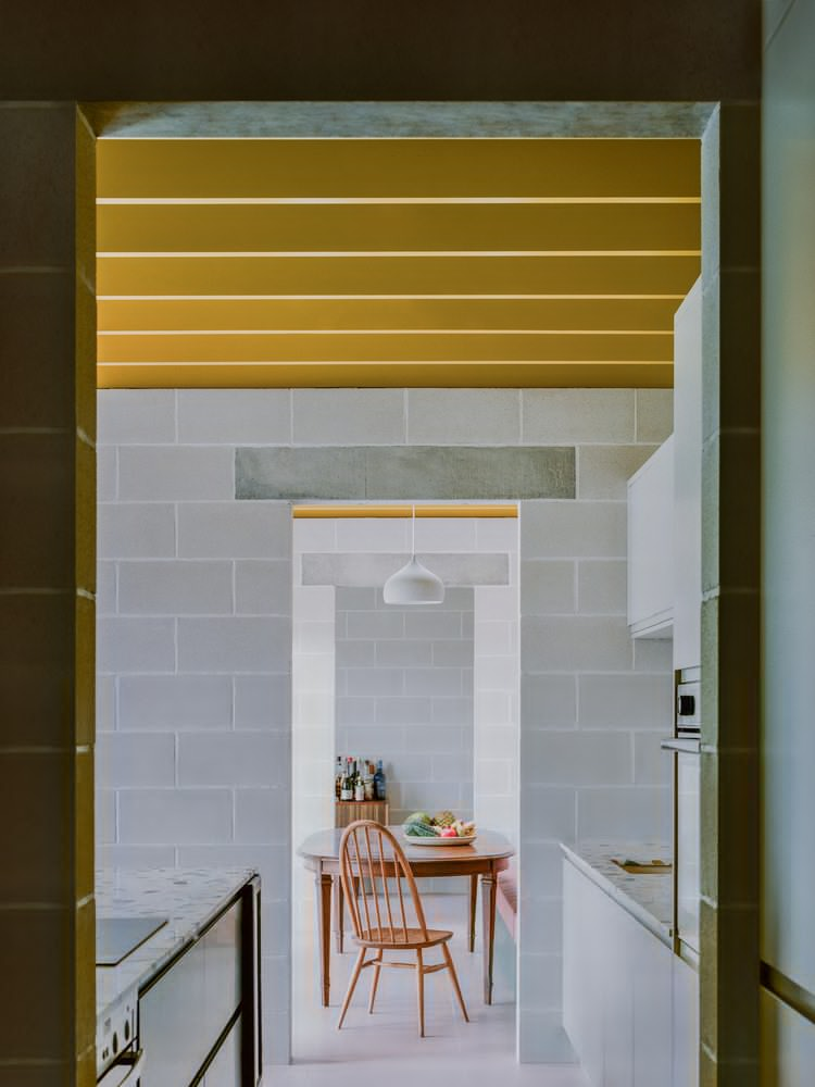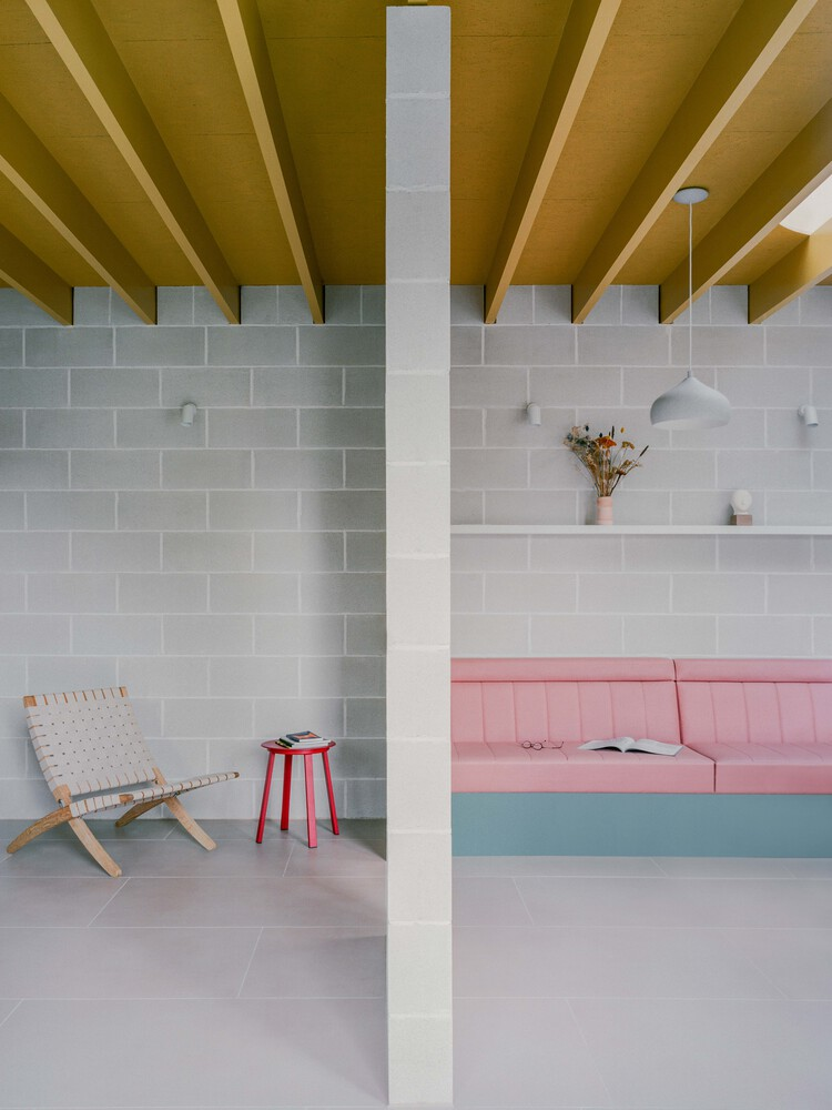 Material efficiency plays a central role in the project’s architectural strategy. Working within a tight budget and aiming to reduce embodied carbon, Artefact Studio developed a lean construction system that prioritises honesty and durability. Single-leaf walls built from hollow fair-faced concrete blocks are left exposed internally, while insulation and render are applied externally. Exposed timber beams and OSB sheathing are celebrated rather than concealed, painted in a vivid yellow that reinforces the project’s expressive identity.