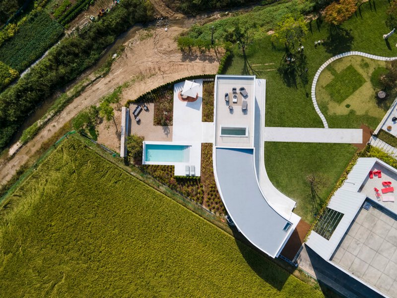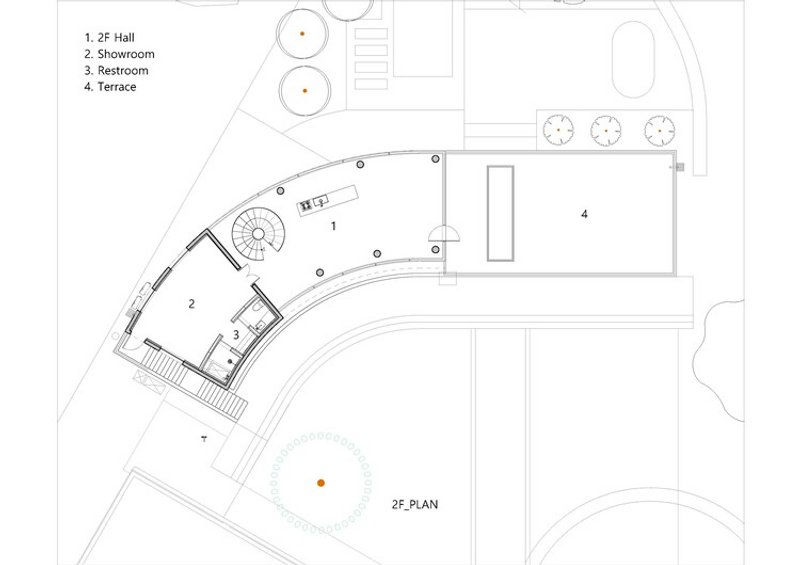 Tribu House by Parnell blends showroom and café, featuring curved facades, streamlined design, and innovative architecture in Yongin-si, Korea.