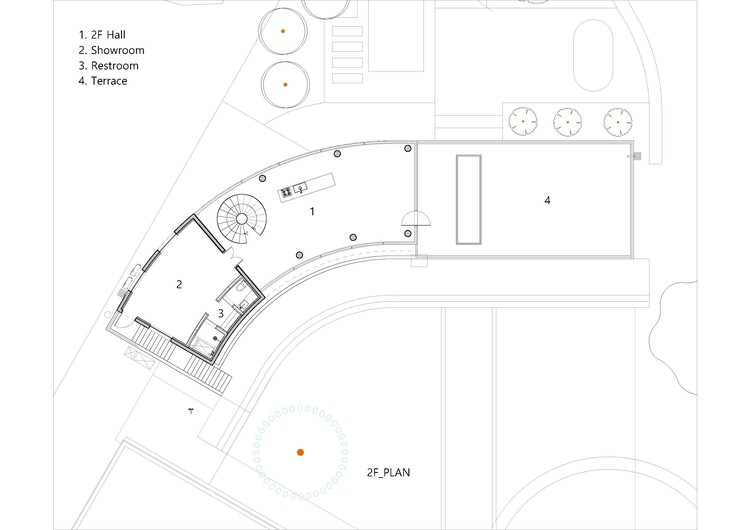 The curved facade is not merely ornamental—it also becomes a backdrop for outdoor furniture displays, extending the showroom concept into the landscape and creating a dialogue between indoor and outdoor environments.