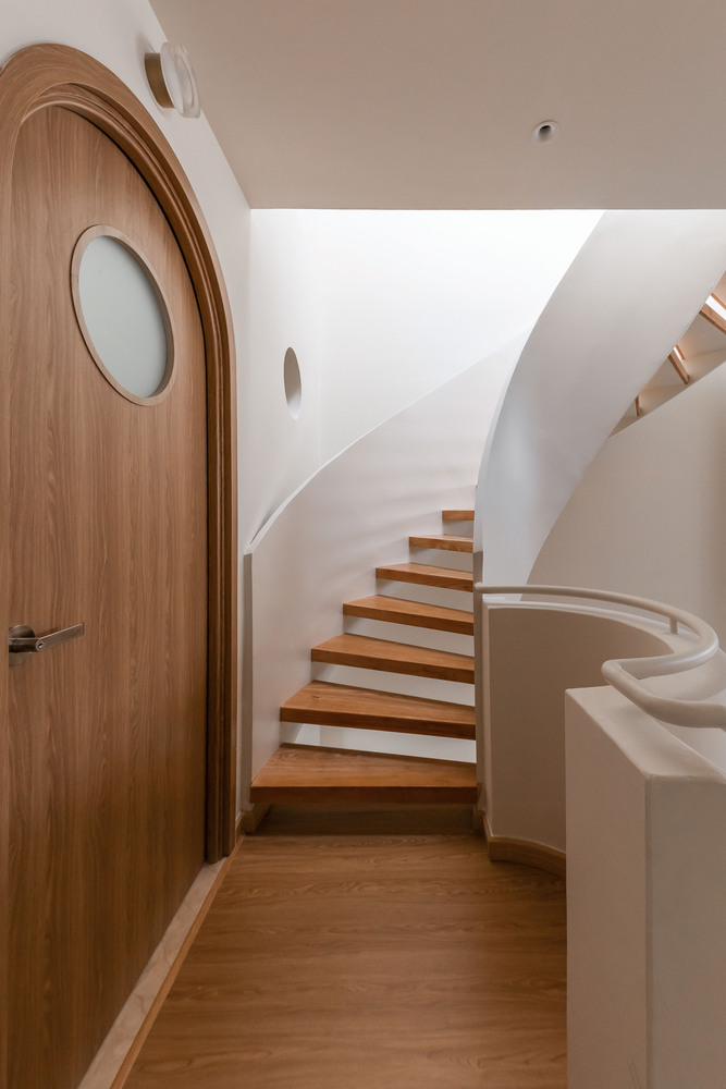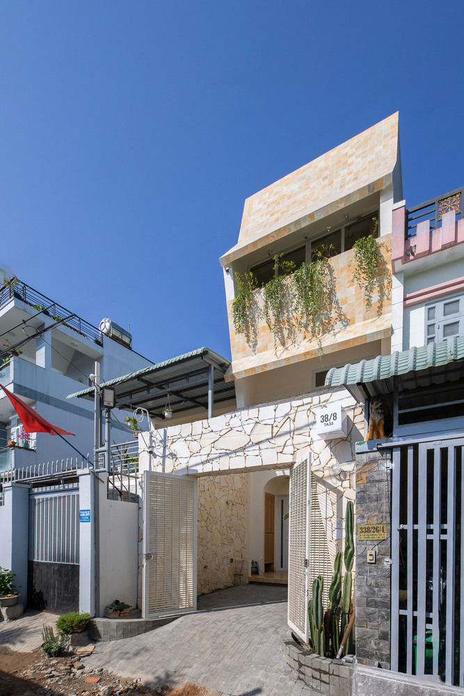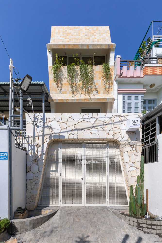 The façade of Origami House takes inspiration from the folds of traditional origami, creating a dynamic, angular structure that enhances both the visual identity and the home’s thermal performance. This folded architecture is not just an artistic statement but a practical response to Vietnam’s tropical heat, utilizing heat-resistant stone tiles to reduce indoor temperatures. The interplay of geometric forms adds depth while ensuring effective shading and ventilation, keeping the house naturally cool and comfortable.