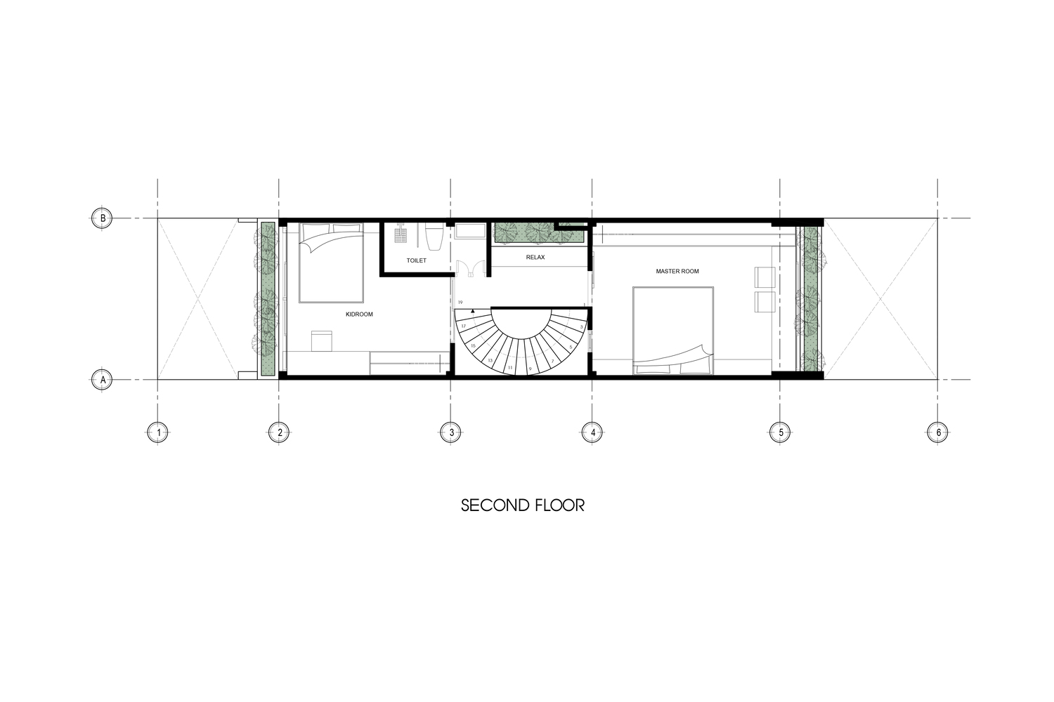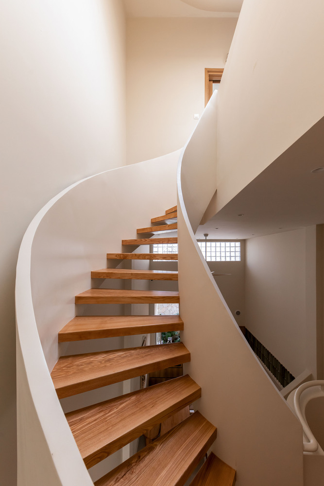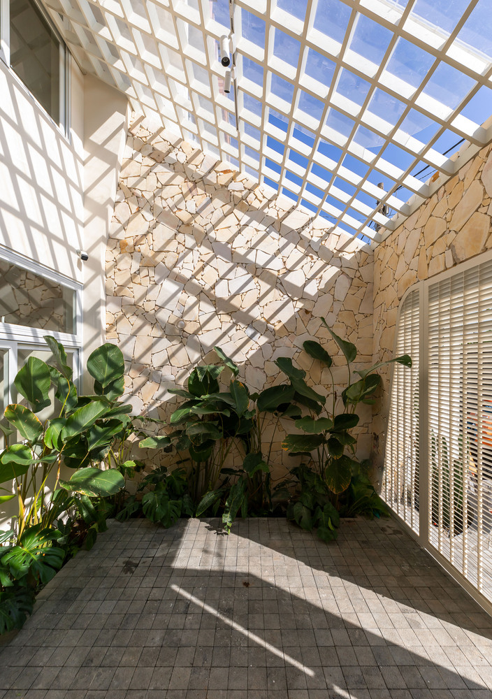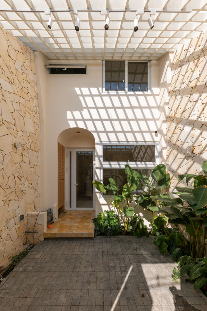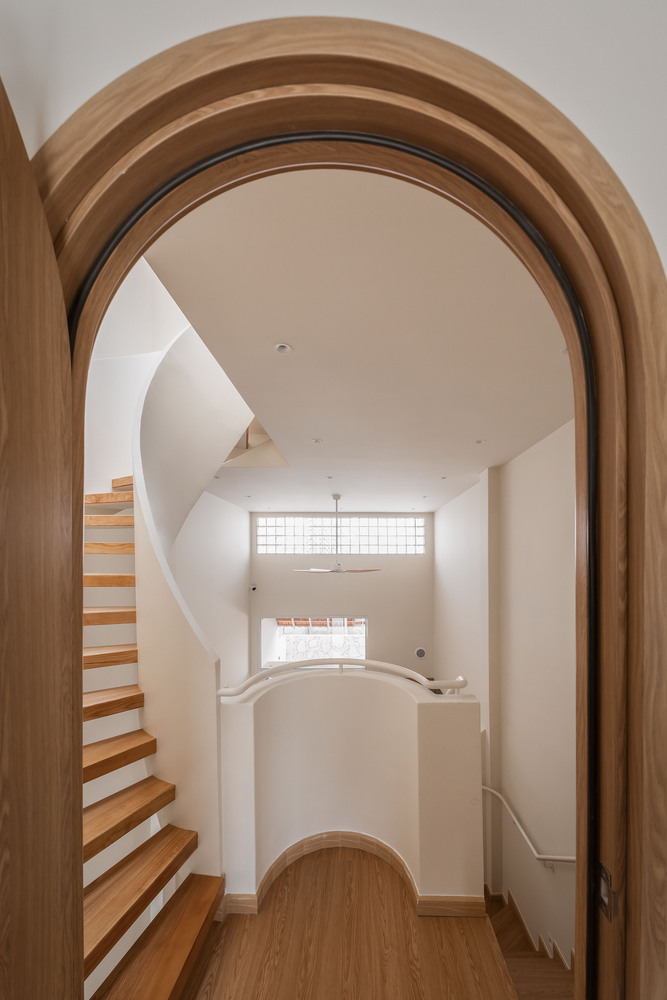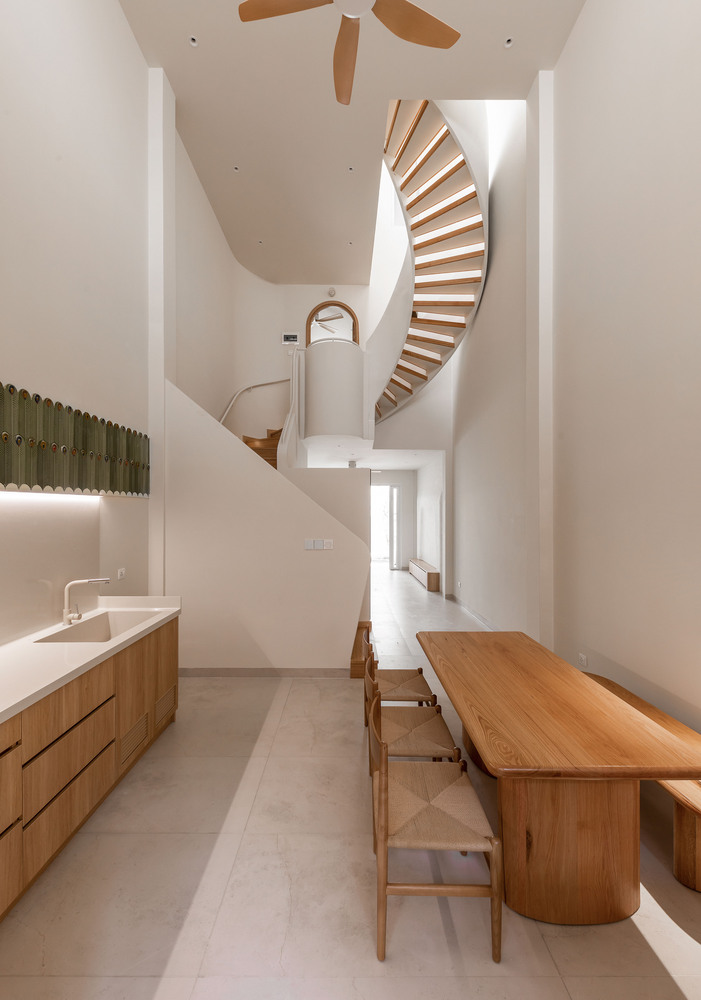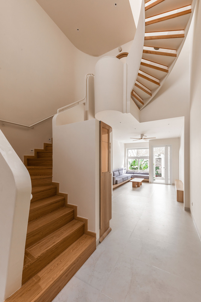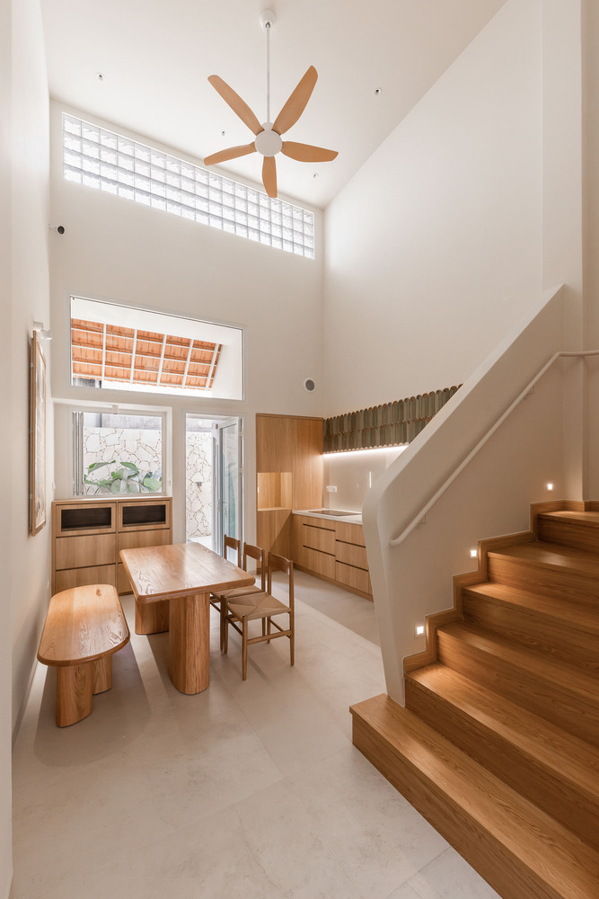 A key feature of the design is the skylight, which allows natural light to filter through while enhancing airflow. This passive cooling strategy is particularly effective for narrow tube houses—a common typology in Vietnam’s dense urban environments. The play of light and shadow within the space creates a dynamic yet serene ambiance throughout the day.