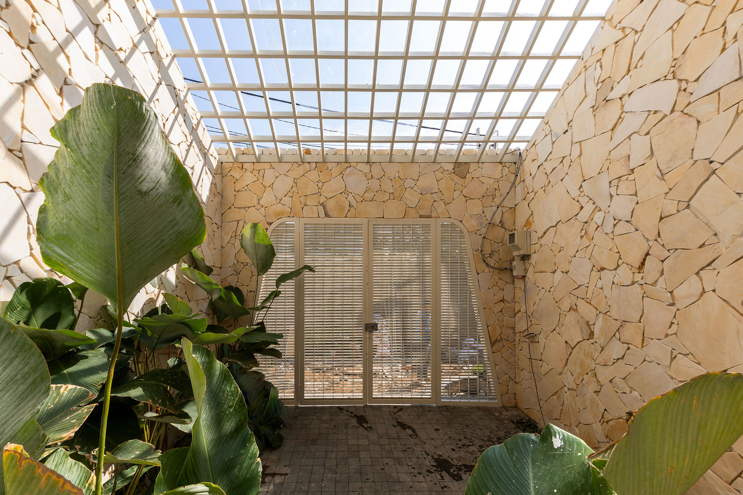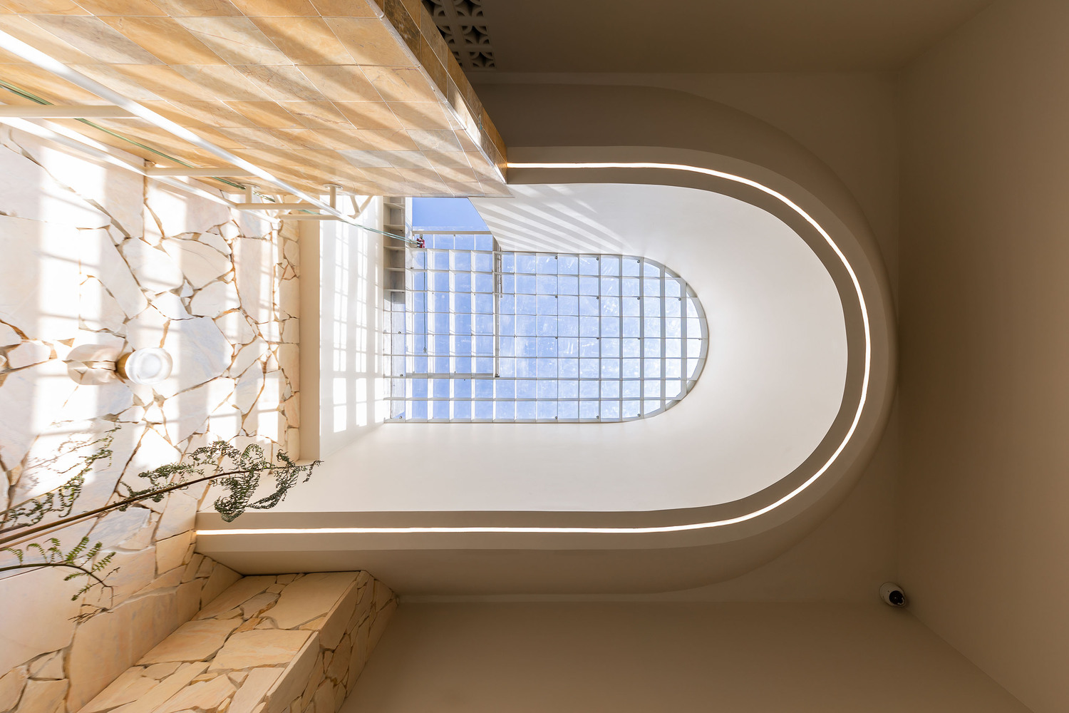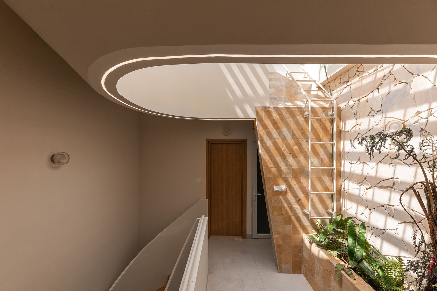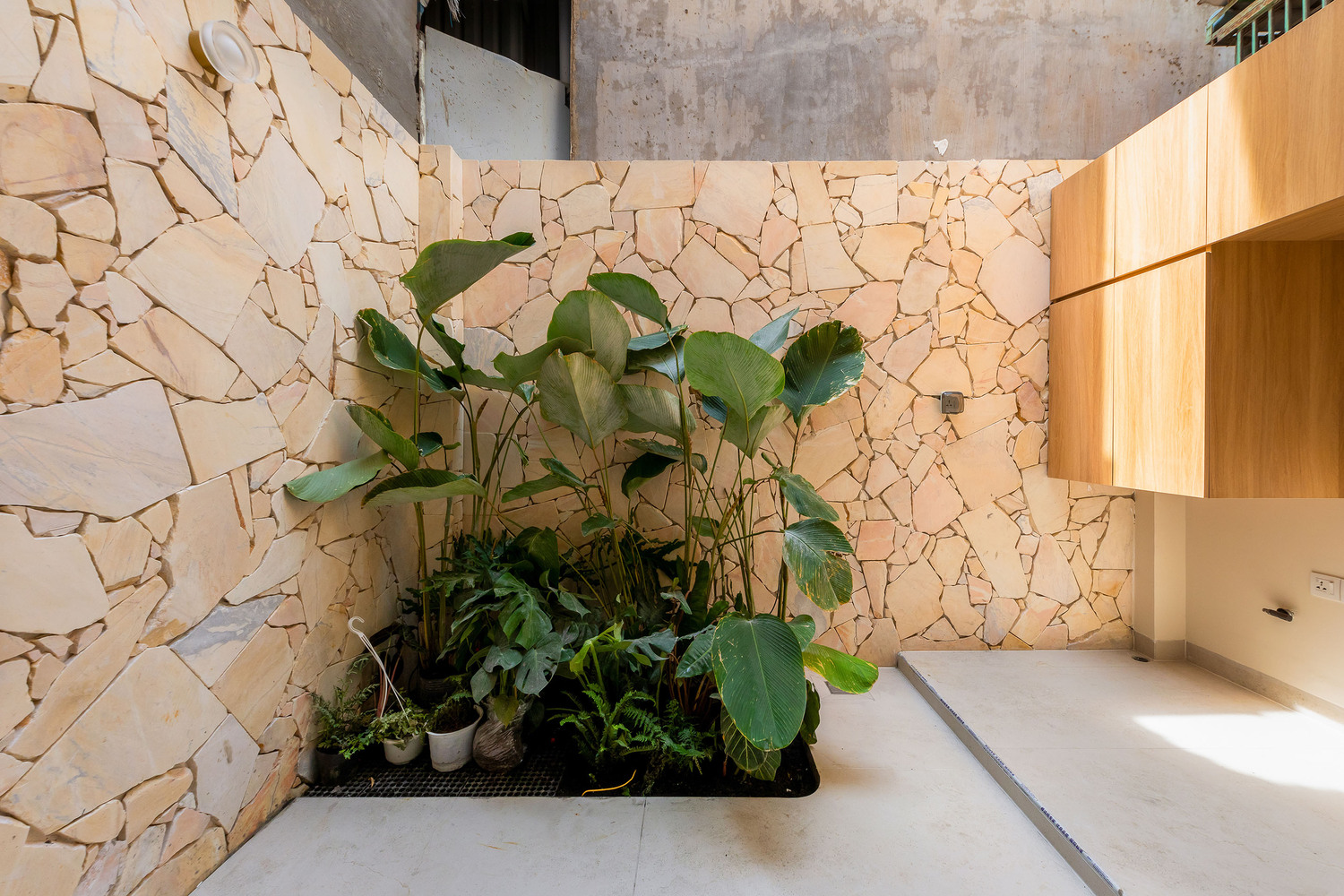 The entrance gate, clad in natural stone, creates a fortress-like presence, offering both privacy and a striking first impression. This gateway acts as a transition from the bustling city streets into the tranquility of the home, emphasizing the concept of an urban sanctuary.
