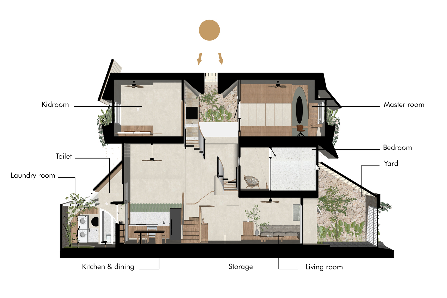 The Origami House embraces sustainable principles tailored for tropical architecture. The combination of natural ventilation, heat-resistant materials, and passive cooling techniques minimizes reliance on mechanical air conditioning, reducing the home’s carbon footprint. The design prioritizes cross-ventilation, ensuring that fresh air circulates effectively, while the integration of indoor gardens and open courtyards enhances the connection with nature.