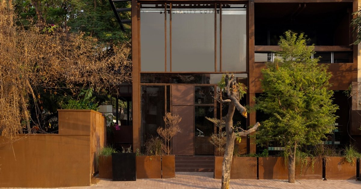 Minimalist café in Hyderabad by NaaV Studio featuring earthy tones, raw steel, and glass façades blending warmth, light, and industrial elegance.