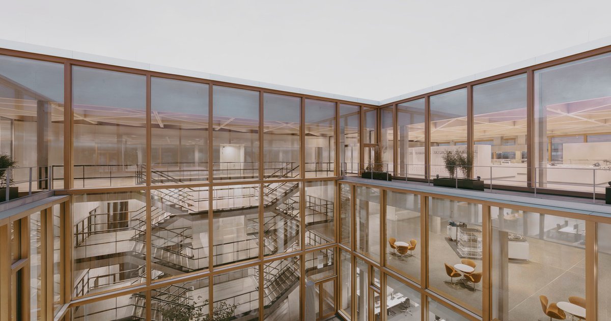 The Tech Center’s cubic form is punctuated by staggered levels, cantilevered canopies, and terraces, lending it a dynamic and horizontal aesthetic. The façade’s use of wood and glass distinguishes it from neighboring metal-clad buildings, conveying its unique role on campus. The central courtyard becomes a focal point, promoting transparency and interaction. The open staircase, adorned with mirrored surfaces, acts as a sculptural centerpiece, emphasizing movement and connection.