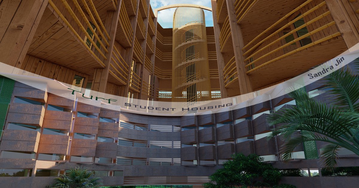 In birds’ view, the building for Turf student housing is in an abstract shape of a koi fish with arched columns framing it up at the center. It symbolizes a living fish spirit hovering along the clean river, it highlights the strength of each college student trying like a koi flying pass the Dragon Gate after thousands of jumps. To enhance the concept of environmental protection, various aspects are looked at in design to be sustainable in every possible way.