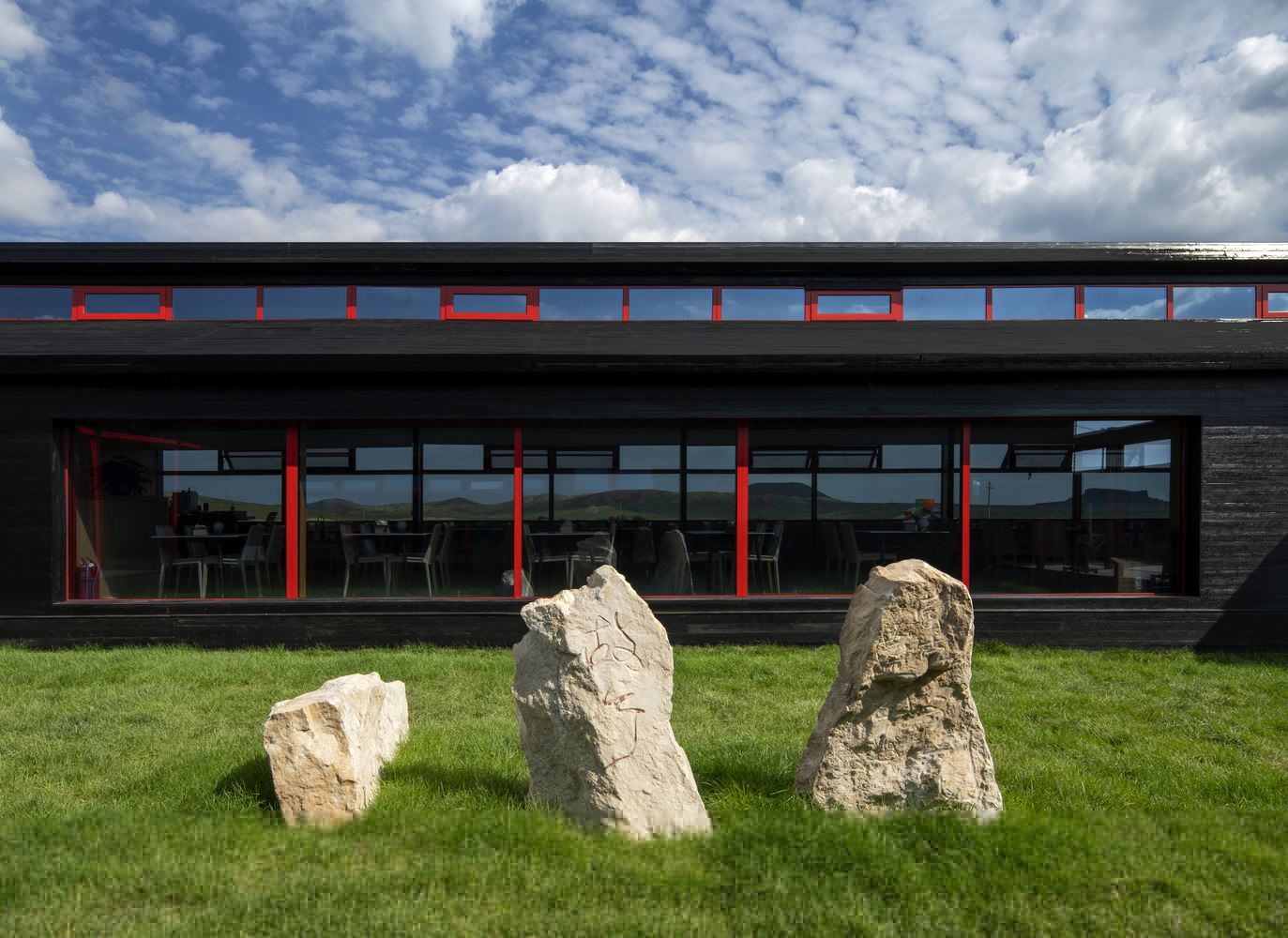 The dining facility, derived from the same pole-type ger logic, adopts an elongated public-space layout that supports communal gathering. A cross-gabled roof with clerestory windows improves natural ventilation, snow shedding, and rainwater management—critical for the region’s climate. Material selection emphasizes sustainability, including engineered timber, charred wood, and locally sourced volcanic stone. Prefabrication reduces waste, onsite labor, construction time, and carbon emissions, while improving thermal insulation and long-term building performance.