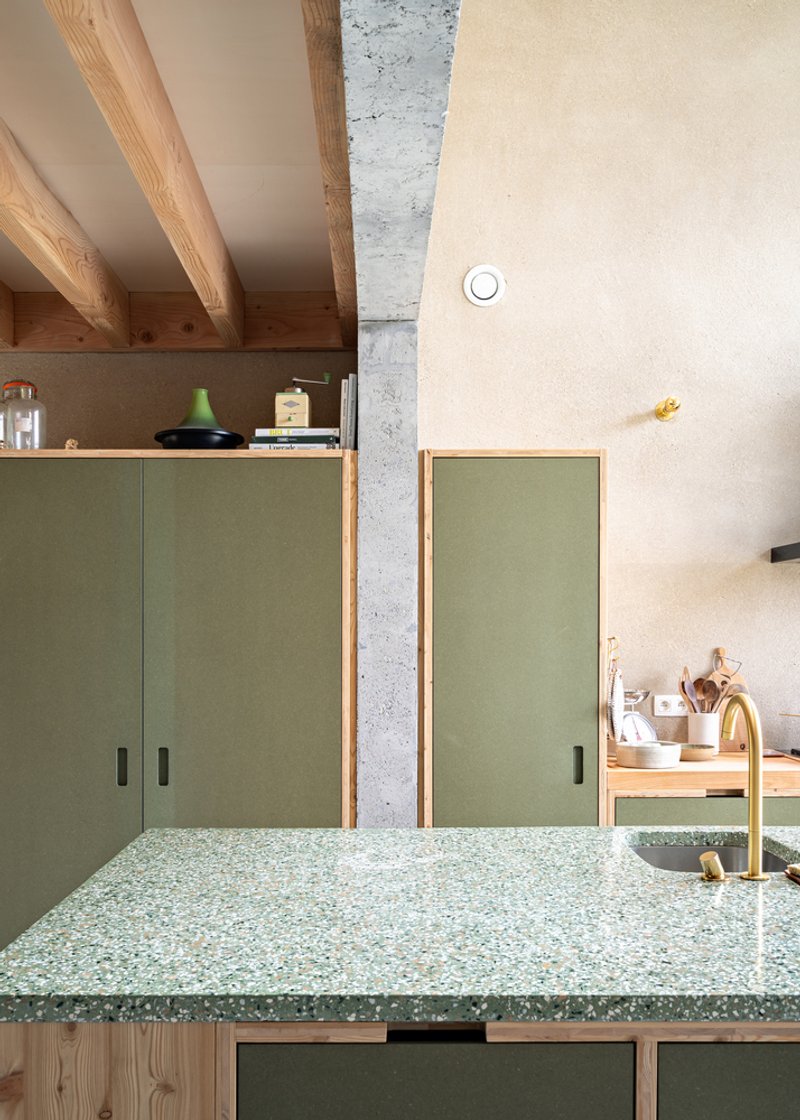 Sustainability was at the heart of the project. Together with PUUR-bouwen & Giant Projects, the architects prioritized bio-ecological materials. Hemp lime insulation and cellulose roof flakes provide excellent thermal performance. Interior walls are finished with loam plaster, while the bathrooms feature tadelakt, a traditional lime-based, water-repellent finish.