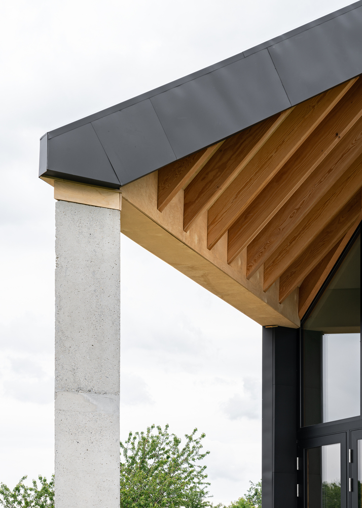 The 4,500 m² plot is designed as a living landscape rather than a paved surface. Parking areas are finished with gravel lawns, while floating steps lead through a bee-friendly garden to the entrance and studio. The family has already added an outdoor bath and a fruit-picking maze, reinforcing the idea of a home that evolves naturally with its inhabitants.