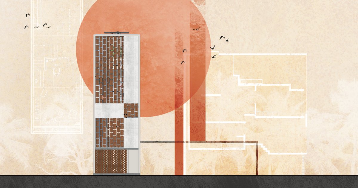 The vertical pivoted louvers of mangalore tiles in the facade, give way for ample natural lighting to light up the internal spaces while also casting shadows in interesting patterns. The interactive nature of these pivoted louvers help in controlling the influx of light and wind flow as per the user’s preference. The stairways, running through the structure, form voids that allow sunlight to enter and brighten up the interiors and also aid the ventilation by permitting air flow.