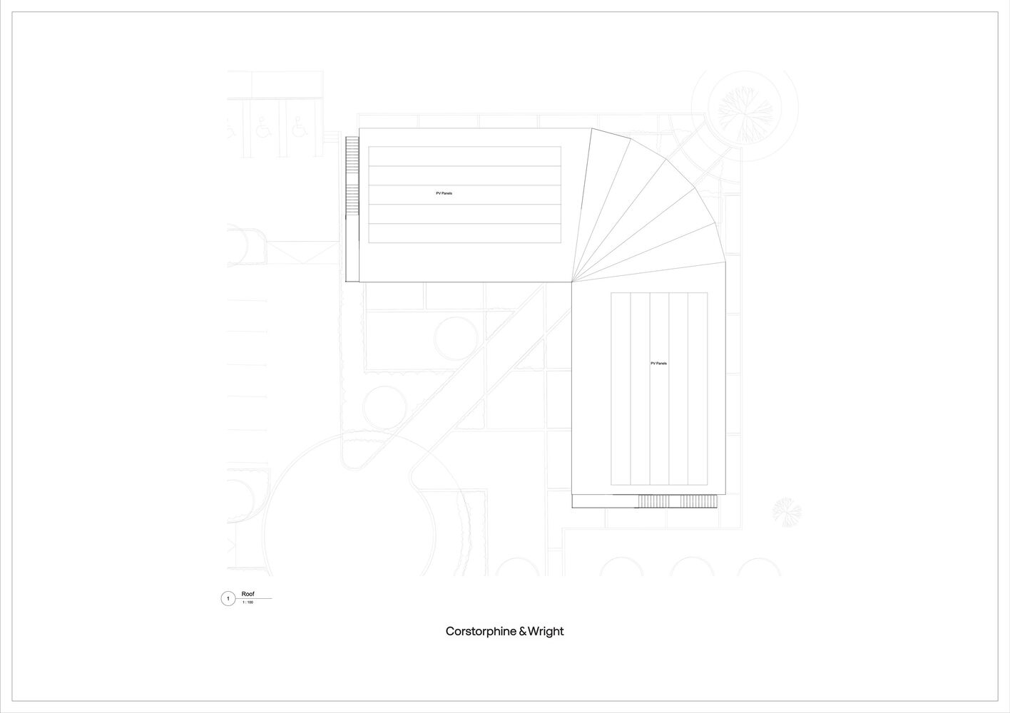 Renewable energy is central to the building's performance. Rooftop photovoltaic panels and an air-source heat pump allow the building to operate with a net-positive energy profile. This energy-conscious strategy extends to the interior design, where mechanical systems are minimized in favor of natural solutions wherever possible.
