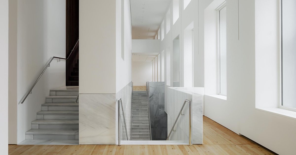 Although its architectural expression is restrained and elegant, the new building befits the grandeur and imagination associated with the term palace. Special focus was put on the finish of the stairs, floors and walls, which blend in pattern and material. Subtle textures are layered through alternating sandblasted, honed and polished marble, playfully brought to life by the reflection of natural light through the pond. Set against the white of the veined marble is the warmth of the walnut applied on the doors, wherever one makes the transition to a new spatial experience.