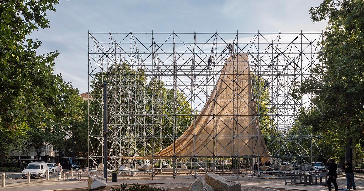 Unveiling the Unfinished Beauty: Giant Scaffolding Wraps Aire Pavilion in Granada, Spain