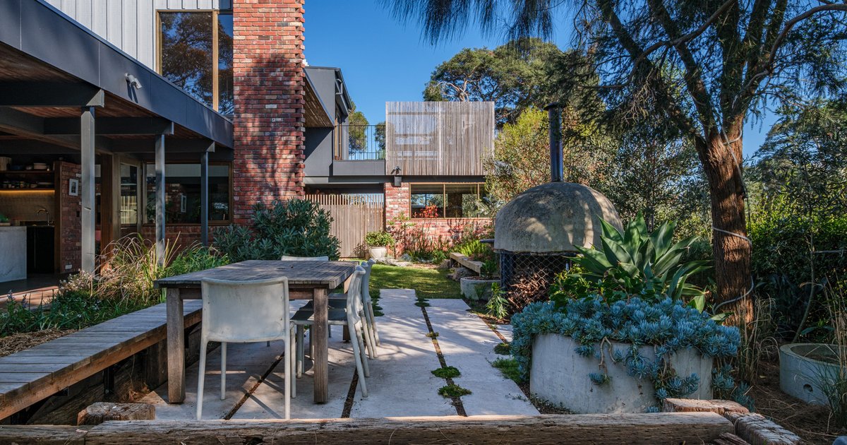 For example, the original red bricks used in the landscaping were carefully salvaged, cleaned, and reused in the new masonry walls. This particular set of bricks had a fascinating history—the original owner had salvaged them from demolished houses in Geelong during the 1970s and had painstakingly cleaned them by hand. Now, these recycled bricks anchor the living room and frame expansive views of the garden, creating a seamless connection between the indoors and outdoors.