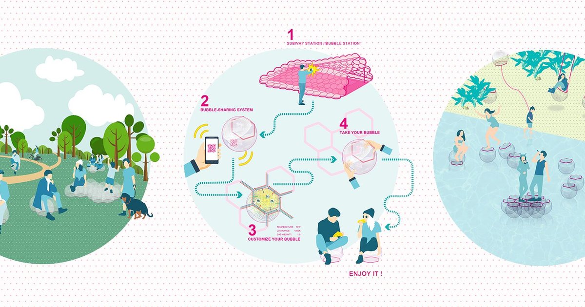The Bubble-Sharing System introduces the concept of renting or borrowing a bubble from one location and returning it to another. These bubbles cater to both New Yorkers and tourists, blending utility with playfulness. Using a dedicated app, users can scan, rent, and customize their bubbles—choosing factors such as temperature, luminance, and chemical elements.