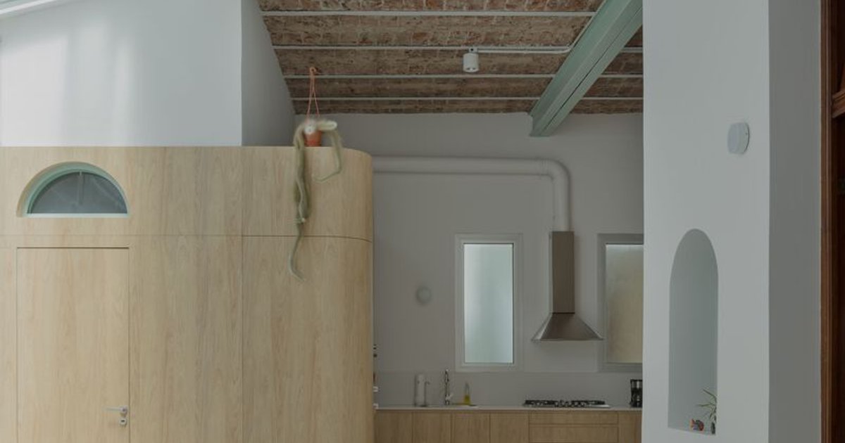 A standout feature in the renovation is the custom-designed curved wooden structure that delineates service areas from social spaces. This not only adds a functional separation but also introduces warmth and architectural character to the interiors.