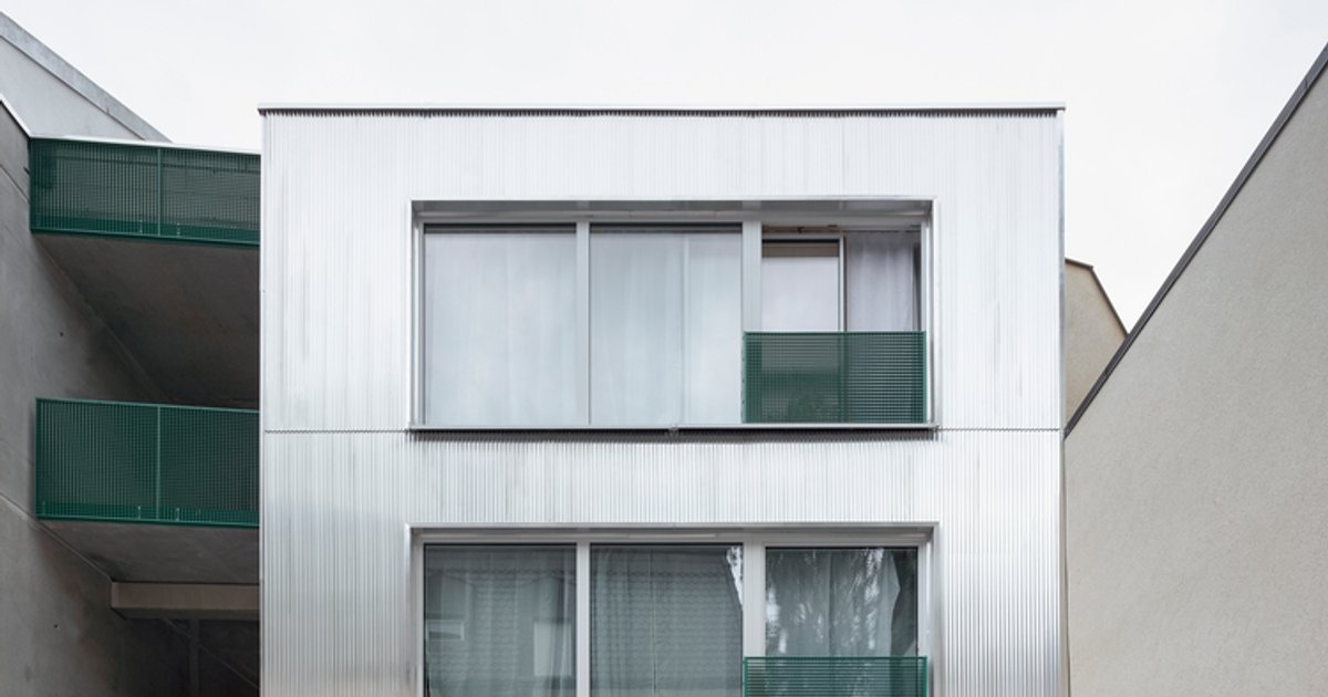 The exterior design of the Backyard House sets it apart from its surroundings. Jagged aluminum cladding gives the building a distinct sculptural character, reflecting both the changing colors of the sky and neighboring structures. This light-colored material enhances daylight diffusion into the courtyard, subtly amplifying the sense of openness in the compact urban site.