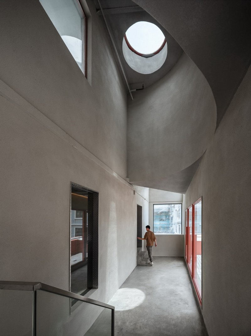 The adaptive reuse design of the Nantou Hybrid Building stands out for its preservation of the complex and contradictory nature of the original structures. The addition of two new volumes on the rooftop—a rectangular and a curvilinear structure—demonstrates a harmonious blend of old and new, solid and void.