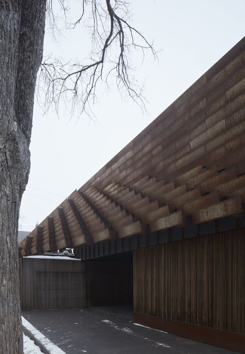 The veil’s perforations are carefully designed to filter sunlight into the interior while providing privacy from the street and neighboring homes. Its warm, velvet-like patina evolves naturally over time, blending with Winnipeg’s dry and often sunny climate. While the weathered steel stands out as an unexpected material in the neighborhood, the veil’s geometric form echoes the steep hip roofs of nearby neo-Gothic and neo-Georgian houses. This creates a dialogue between tradition and innovation, architecture and sculpture, ornament and structure.