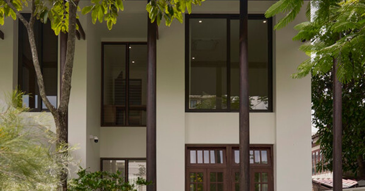 Materiality is central to Verdure Villa’s warmth and character. While the structural system relies on straightforward brick and concrete walls, the atmosphere is defined by timber floors, rounded columns, wooden windows, and reclaimed vintage doors sourced from an old school. These elements reference Thai vernacular architecture, interpreted through contemporary detailing and craftsmanship. The use of traditional materials and forms grounds the house in local culture while maintaining a modern architectural language.