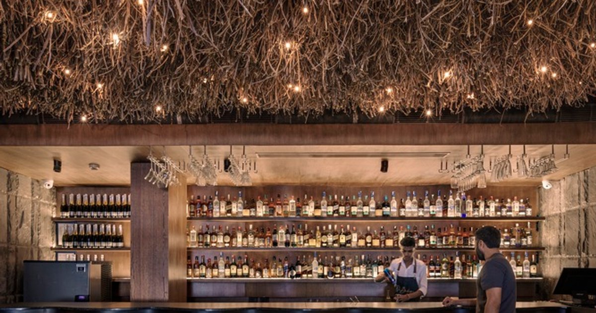 Bodega’s interior is divided into three distinct zones, each with its own atmosphere and function. The bar area, located on the left, features an undulating ceiling made from twigs, straw, and thatch, lit by incandescent bulbs that create a stark, almost otherworldly mood. This area serves as a transition point between the more relaxed seating areas and the more intimate private dining space.