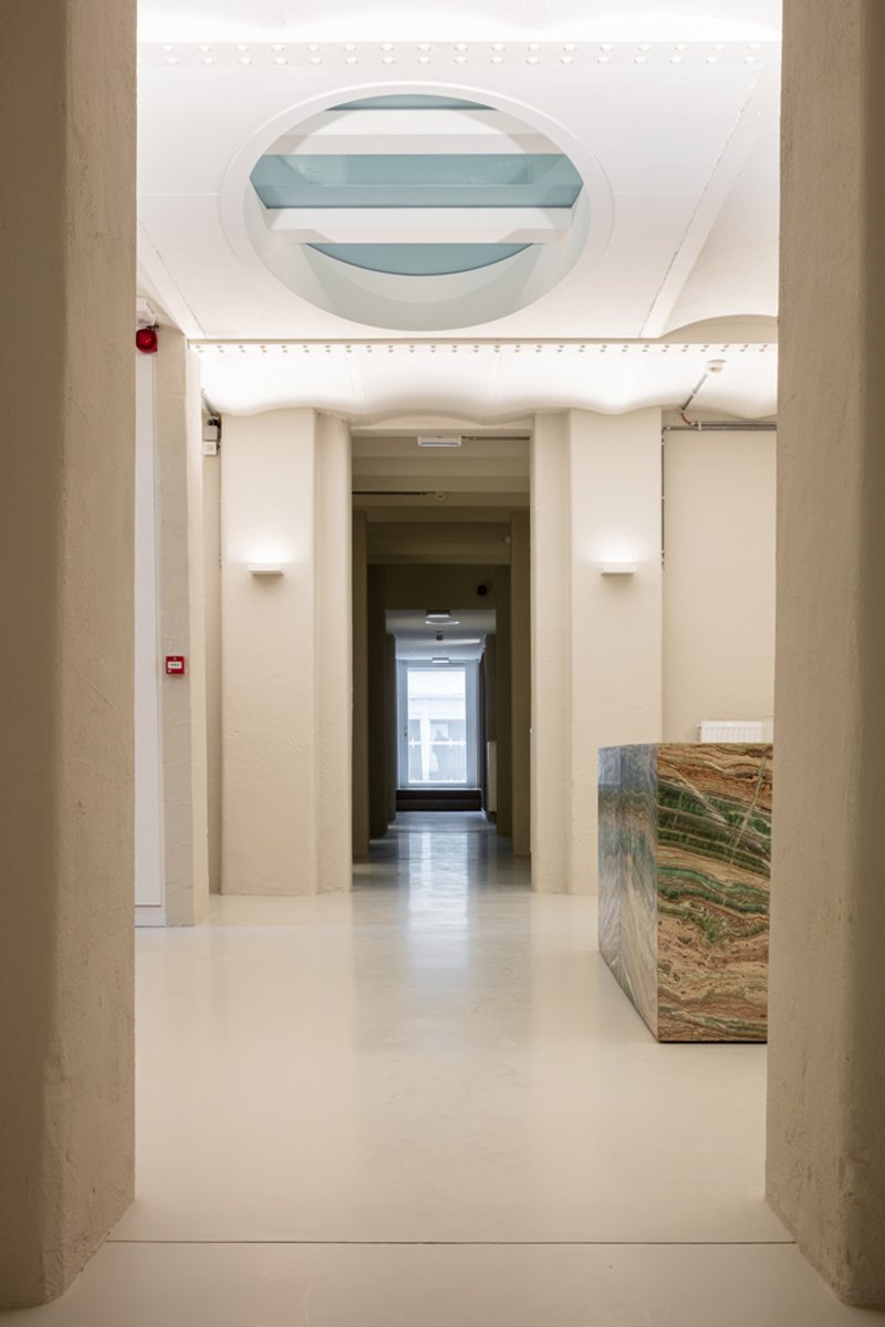 The renovation avoids stark contrasts. Instead, the architects introduced subtle, contemporary layers using materials and color tones that echo the original character of the building. These careful interventions ensure a harmonious dialogue between historical craftsmanship and modern functionality.