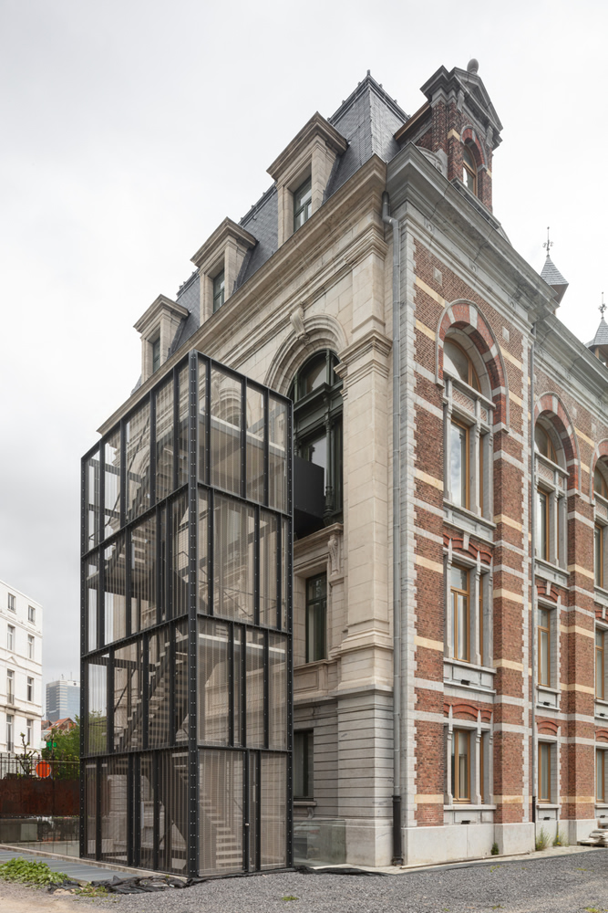 To meet modern safety regulations without damaging the historic fabric, HASA Architecten designed freestanding external fire escape staircases on both sides of the building. These mesh-wire structures connect to a cantilevered bridge, accessed through two converted window openings. Importantly, this entire intervention is fully reversible, ensuring no permanent alteration to the protected building.