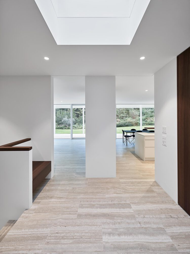 Inside, the villa features a refined, minimalist design palette dominated by travertine, white plaster, and bronze oak. The travertine-clad fireplace, which serves as a central spatial object, divides the living and dining areas, enhancing the fluidity and openness of the floor plan. Oak is incorporated in several subtle ways, such as in the furniture, cabinetry, and railings, providing warmth and texture to the modern interior.