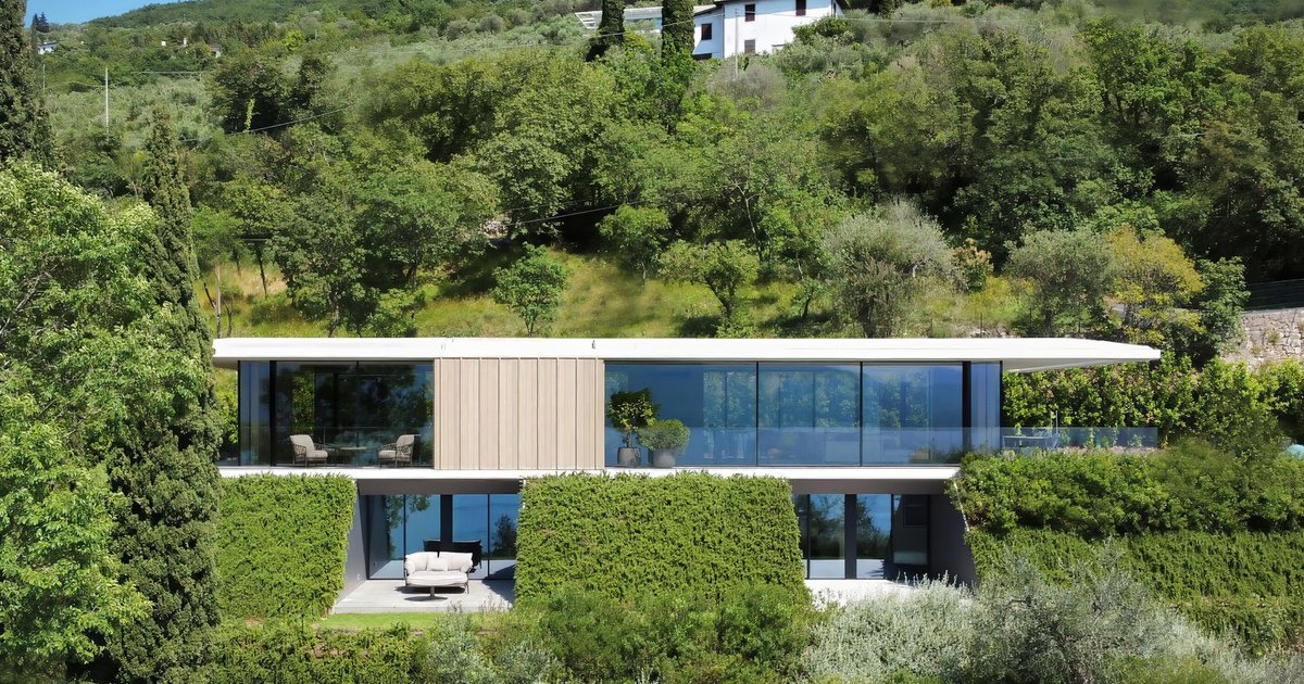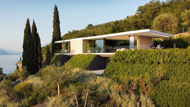 A minimalist lakeside villa with glass façades, custom interiors, cantilevered roof, and terraced landscape seamlessly integrated into Lake Garda’s natural slopes.