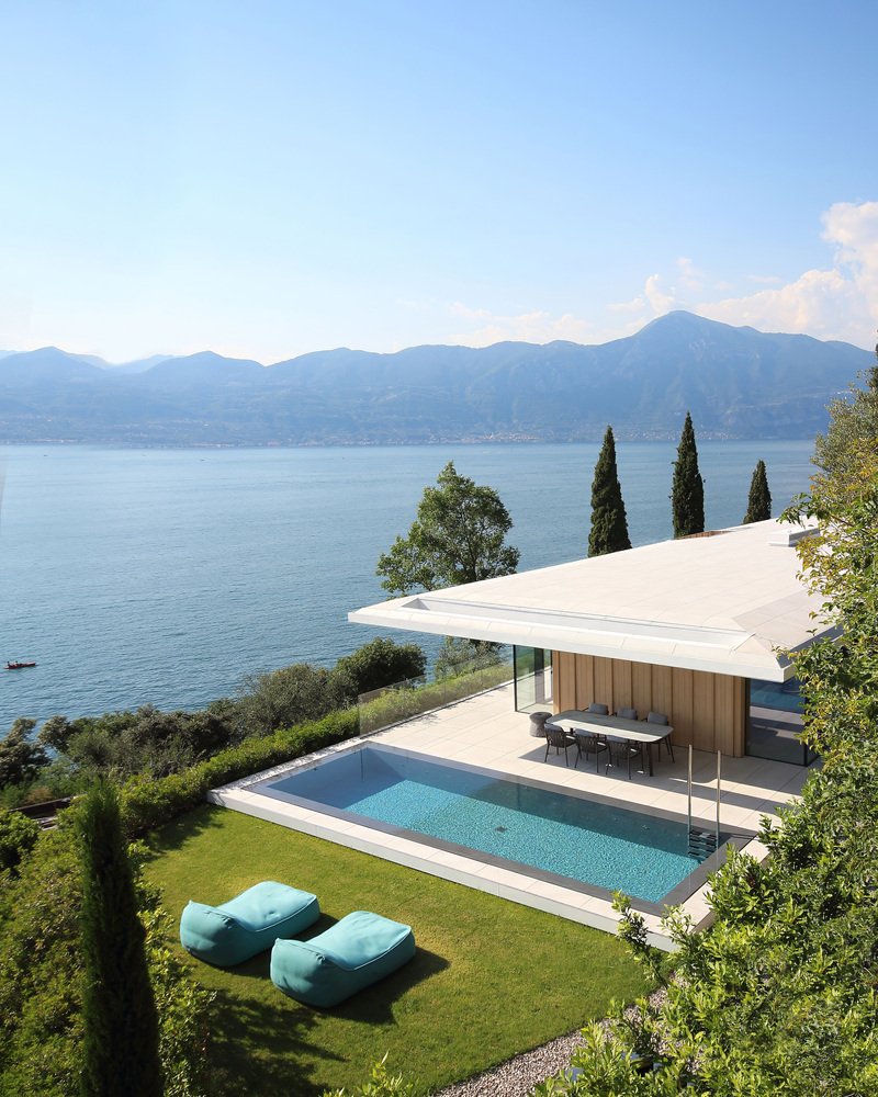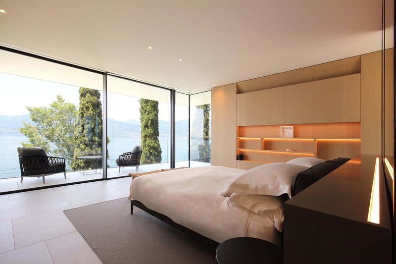 The main façade is defined by extensive glazing, allowing every room to enjoy uninterrupted panoramas of Lake Garda. This creates a sense of weightlessness—the pavilion reads as an open and permeable volume immersed in greenery.