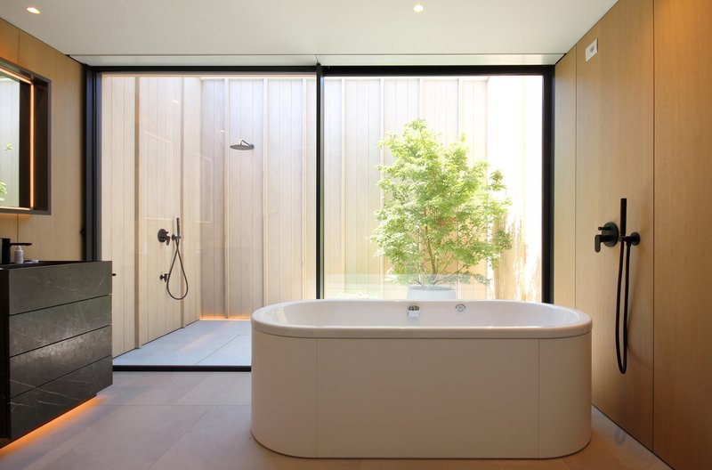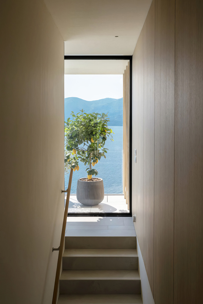 The interiors continue JM Architecture’s signature minimalist approach, featuring custom-made fixed furniture, oak wall paneling, and integrated storage that enhances the clean lines of each space. In the bathrooms, marble vanities add a sculptural touch, while the open kitchen incorporates concealed technical equipment for a seamless, uncluttered appearance.