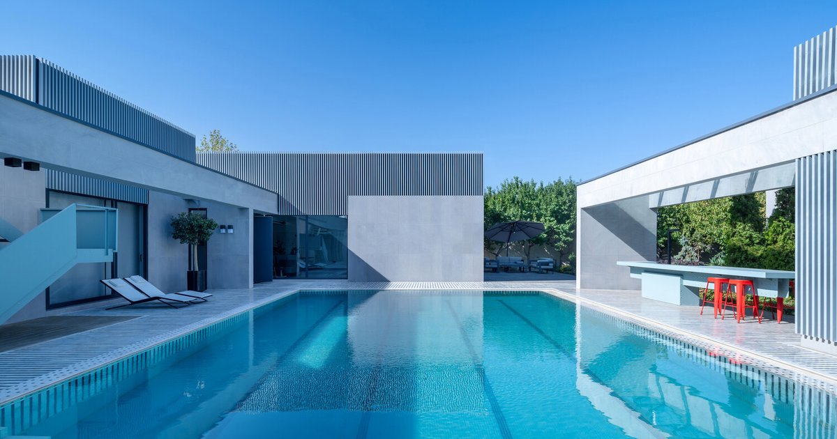 The villa is organized around a central courtyard anchored by a large pool, originally intended for agricultural water storage. Instead of removing this historic element, the architects integrated it as the heart of the villa, creating a peaceful, reflective courtyard that connects interior living spaces, landscaped gardens, and the villa’s roof. The roof design frames panoramic views of the neighboring farmlands, extending the visual connection beyond the enclosed courtyard.
