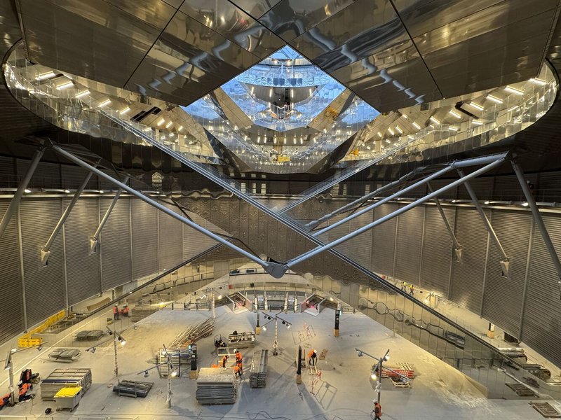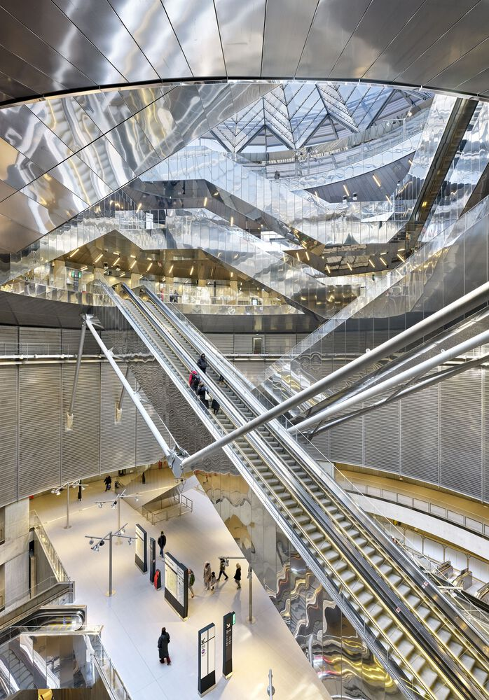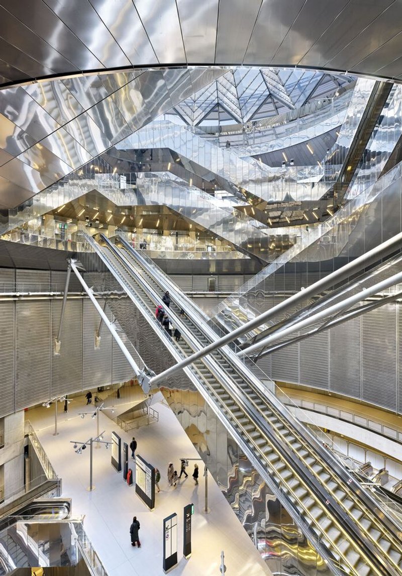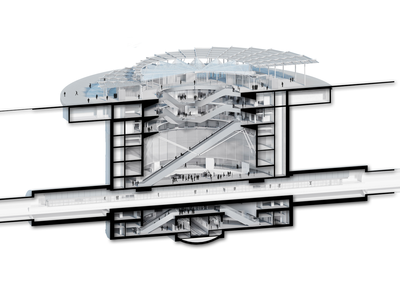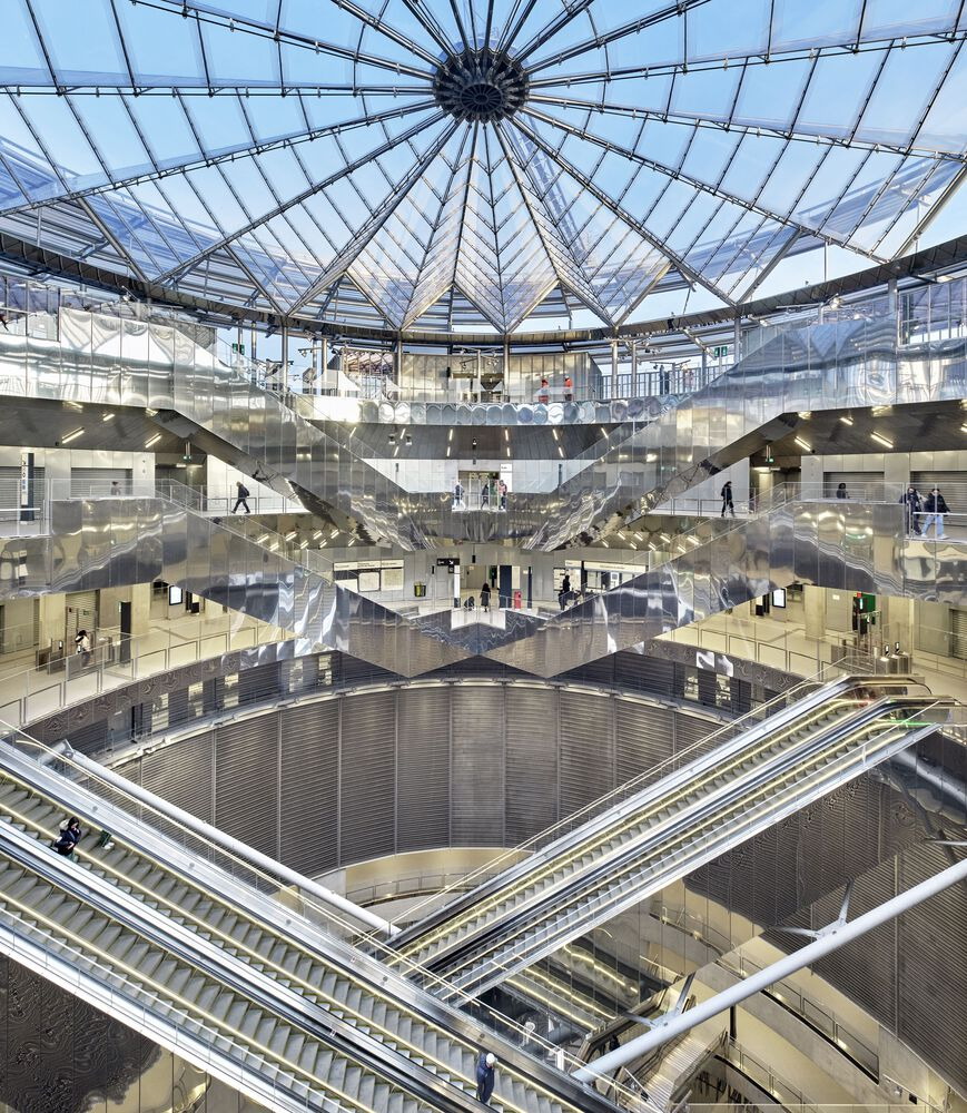 A significant aspect of the station’s design is its ability to connect the urban space above with the subterranean domain below. The station’s central void, a monumental space, spans 70 meters in diameter, flooding the underground levels with natural light. The open-air circulation spaces and balconies further enhance the station’s relationship with its environment. With minimal walls or façades, the station emerges as an open architectural element, contributing to the transformation of the surrounding district into a vibrant, connected space.