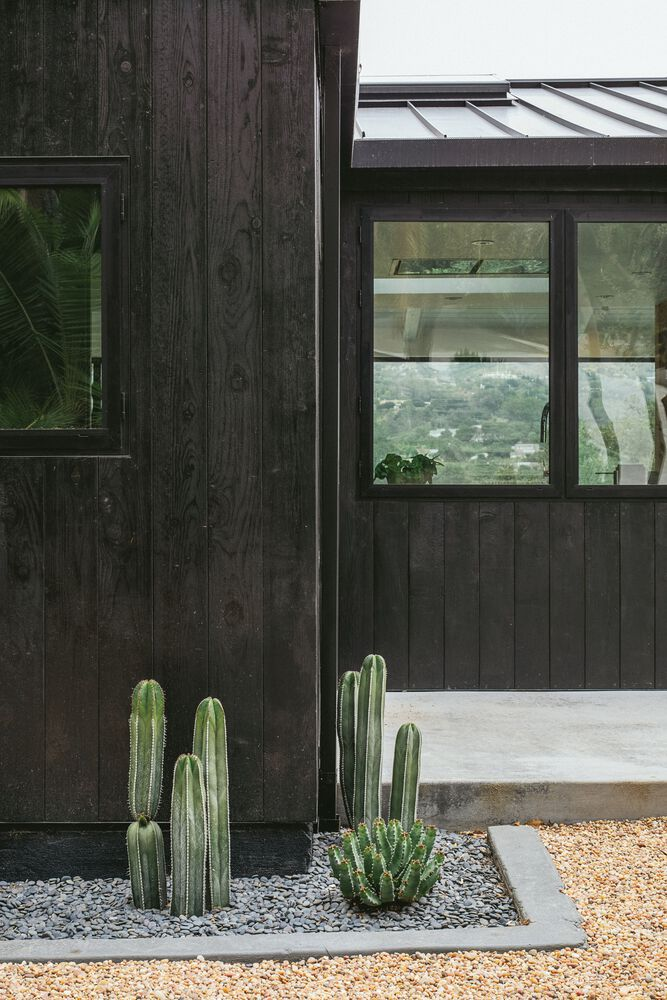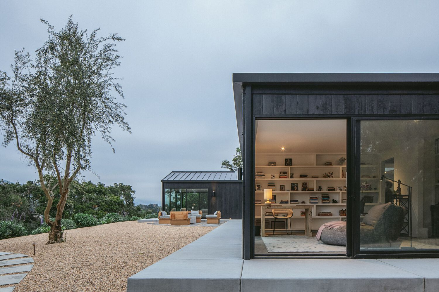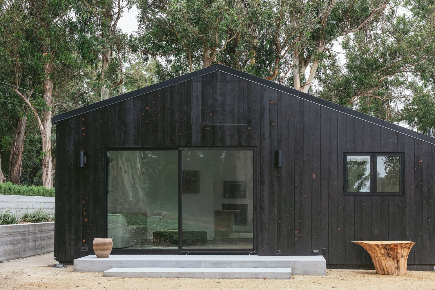 The home’s materiality was redefined to echo the surrounding landscape. The existing T1-11 wood siding was replaced with charred shou sugi ban cedar cladding, a technique that enhances durability while blending effortlessly with the native California oak trees. Complementing the dark-toned façade, anodized aluminum-and-glass sliding doors create a seamless flow between interior and exterior spaces.