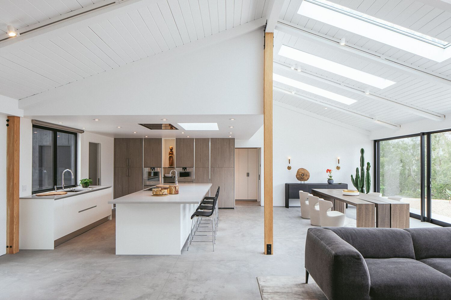 Rather than expanding the home’s footprint, the architects reimagined the existing structure, focusing on spatial efficiency and indoor-outdoor connectivity. The strategic use of expansive glass openings frames breathtaking views of the Santa Ynez Mountains, reinforcing a strong connection to nature.