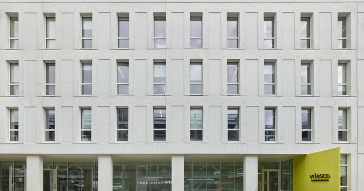 Vitesco Offices in Toulouse feature sustainable design, white concrete façade, landscaped courtyards, flexible workspaces, and elegant, modern architecture by Taillandier Architectes.