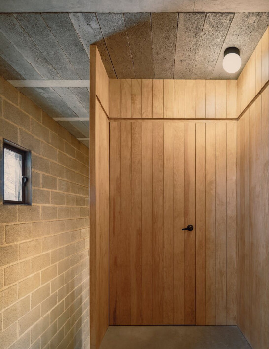 On the upper level, the pinewood dividing walls add warmth to the vestibule area before leading into the two bedrooms, creating a welcoming transition.