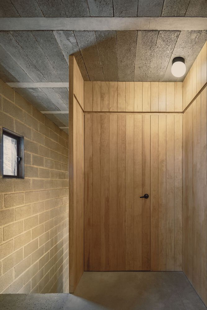 - Interior finishes: Polished concrete floors and warm pine wood dividing walls.