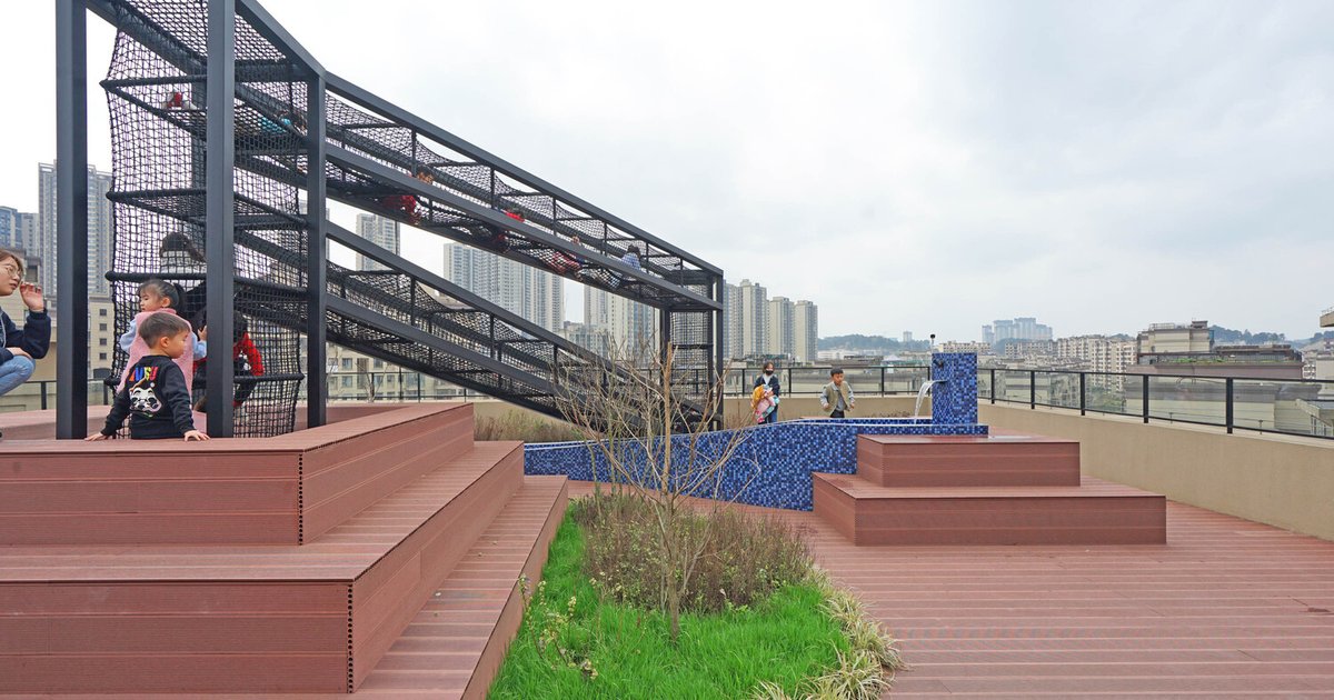 Guiyang’s distinctive karst landforms—including mountains, rivers, waterfalls, limestone caves, and lakes—serve as inspiration for the kindergarten’s interior spaces. The dining room, waiting room, and nursery areas mimic these natural contours, creating a playful yet educational environment. Multi-level terraces feature netted play areas, while strategically placed steps allow children to climb, observe, and interact with the surrounding cityscape and creek, fostering a sense of connection to their urban and natural environment.