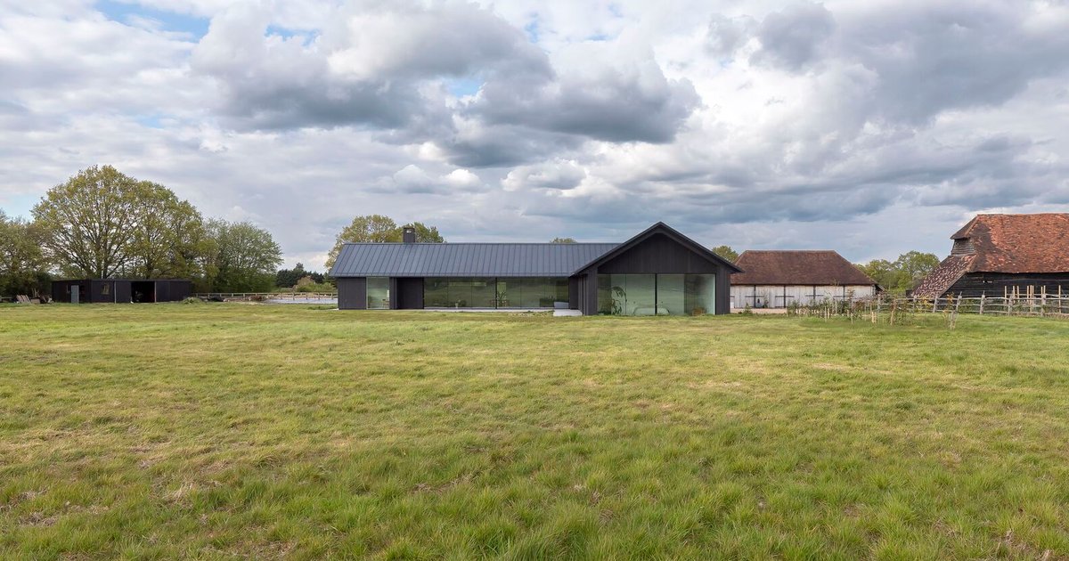 Weald House is a contemporary single-story Kent home blending minimalist design, black barn aesthetics, sustainable features, and panoramic meadow and woodland views.