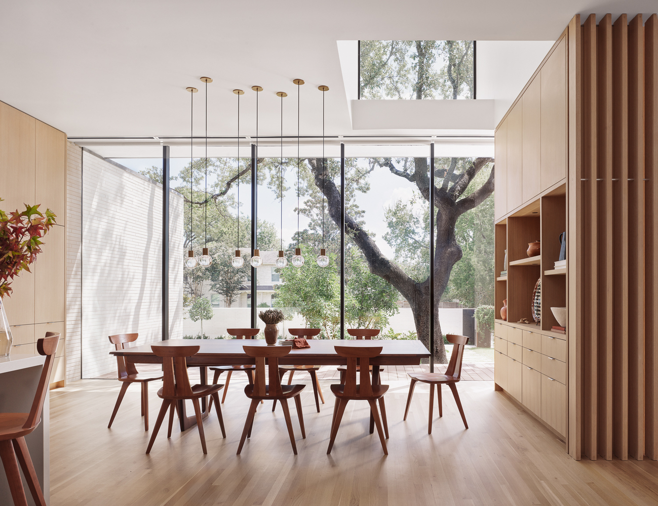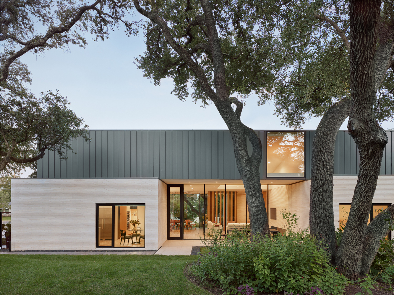 A nature-immersed Austin residence with masonry volumes, open living spaces, abundant light, and a modern single-level layout designed for comfort and longevity.