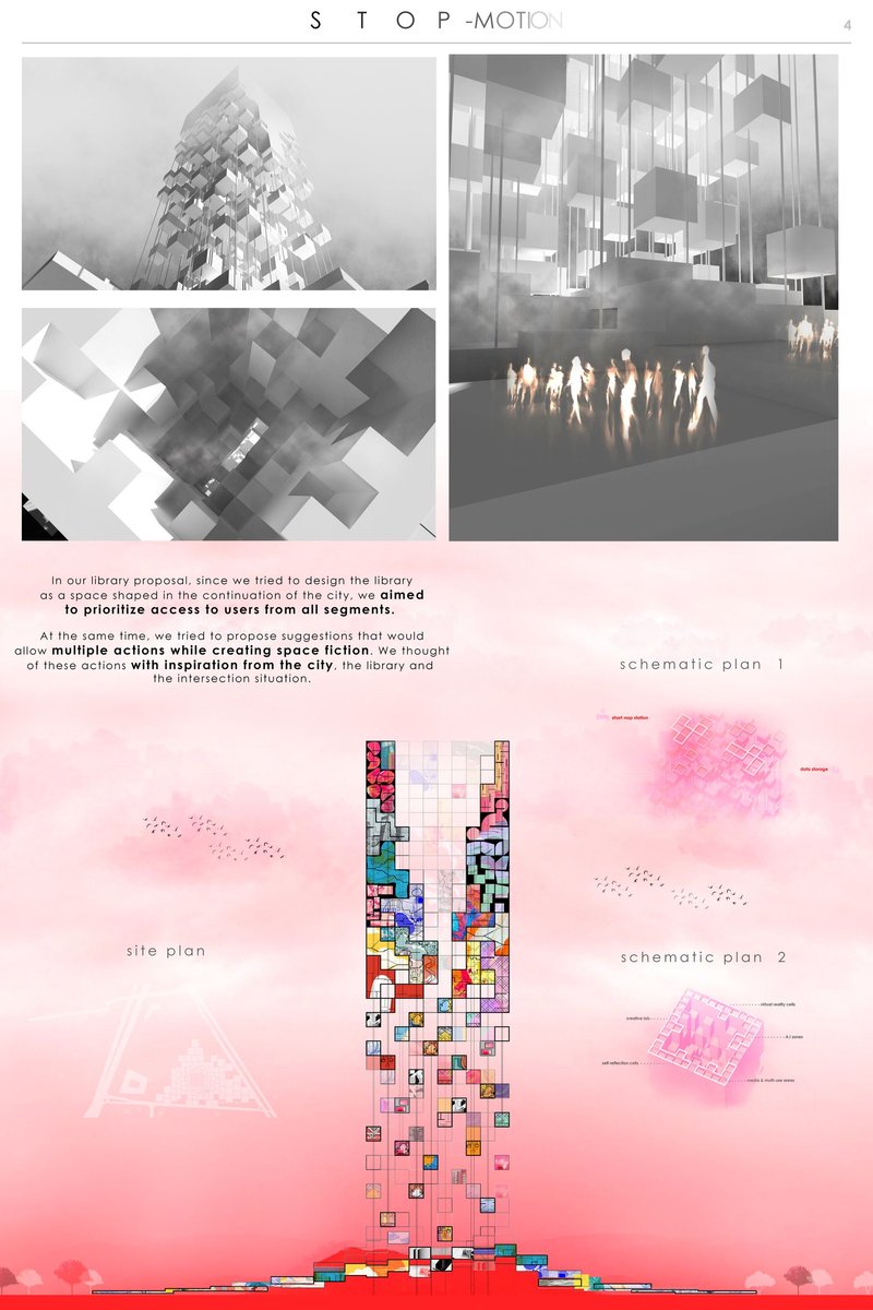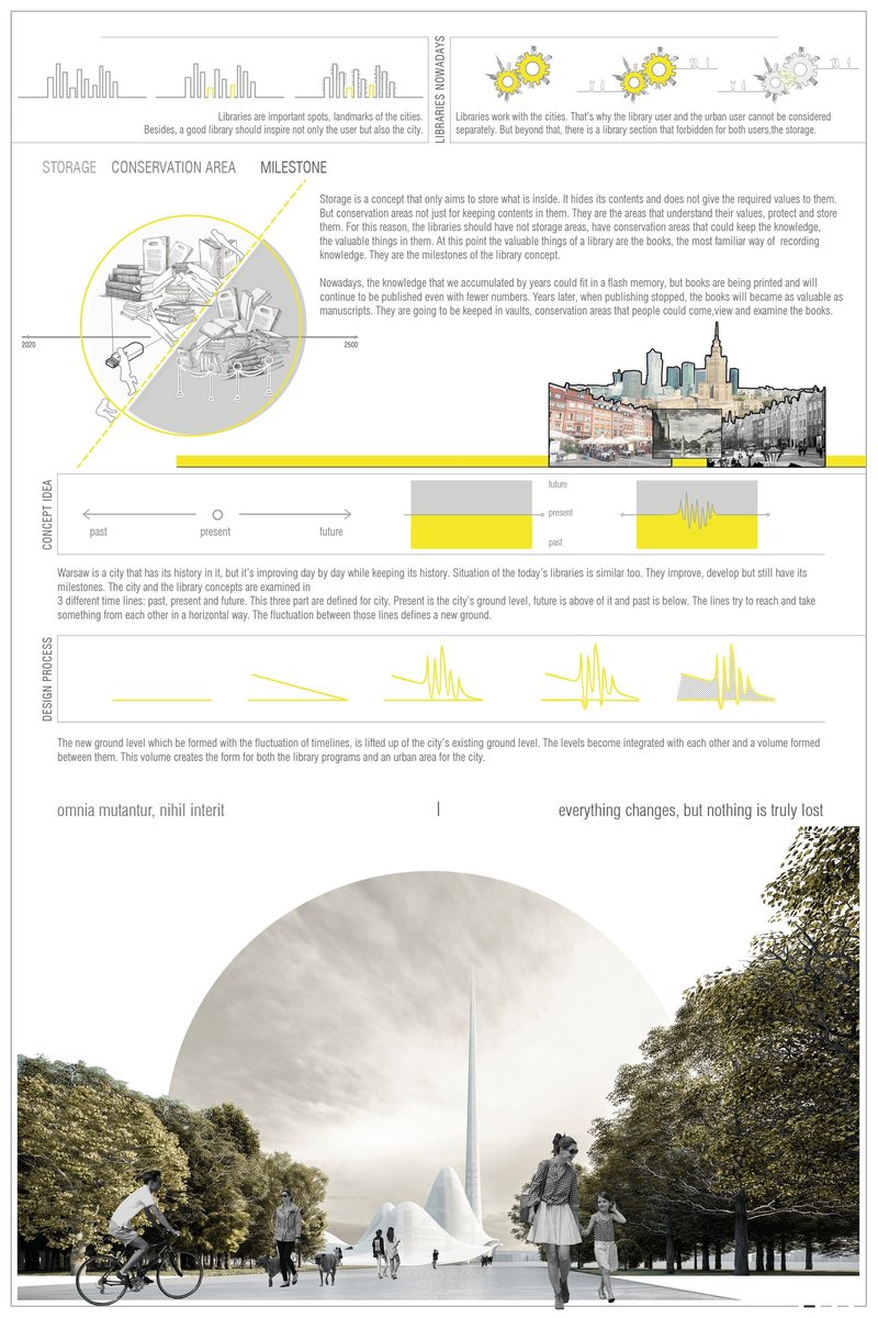 The project establishes the space of self-learning by creating a multi-layered formation in the region with the shell that takes its reference from the historical walls of the city. . With the changing architecture as a result of the concept of individuality, the shell and deformed topography constitute the future library - Beyza Ayaz