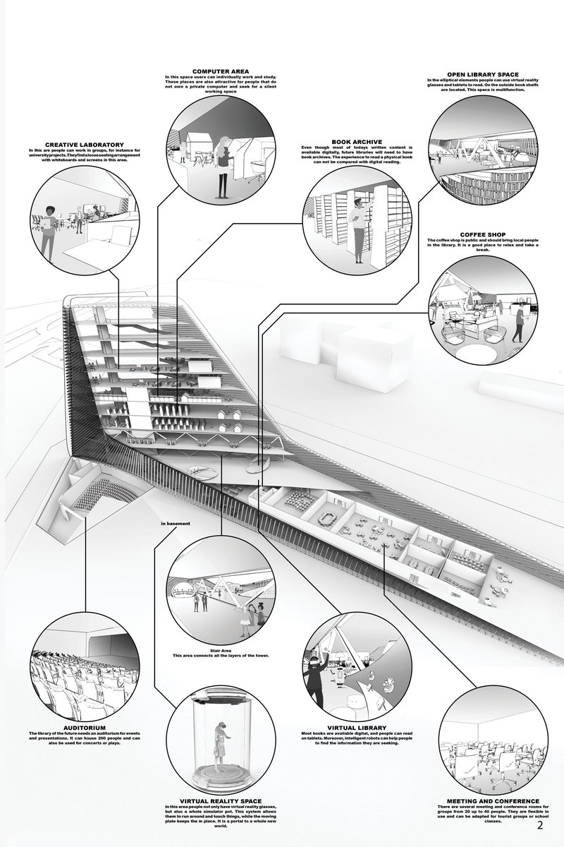 In order to be able to serve as an information hub in the twenty-first century, libraries need electronic workstations and even futuristic technologies such as virtual reality on top of traditional hard-copy books which will always remain at the core of libraries. The design tells a story and manifests the way to wisdom into built architecture. - Thomas Gössler.