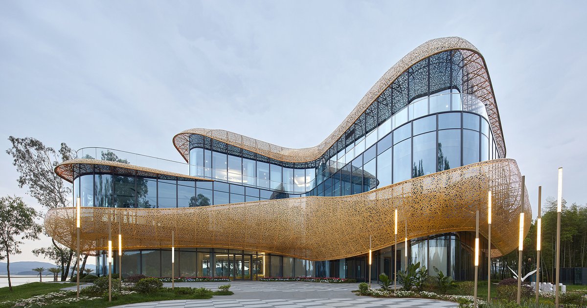 White Crane Lake Visitor Center blends modern architecture with nature, featuring a bamboo-inspired façade, infinity pool, and immersive scenic views.