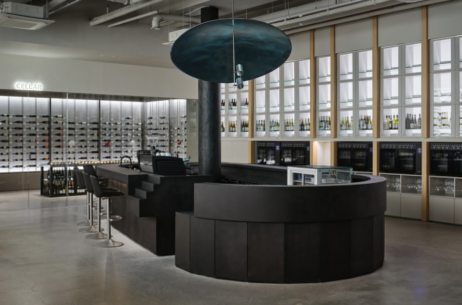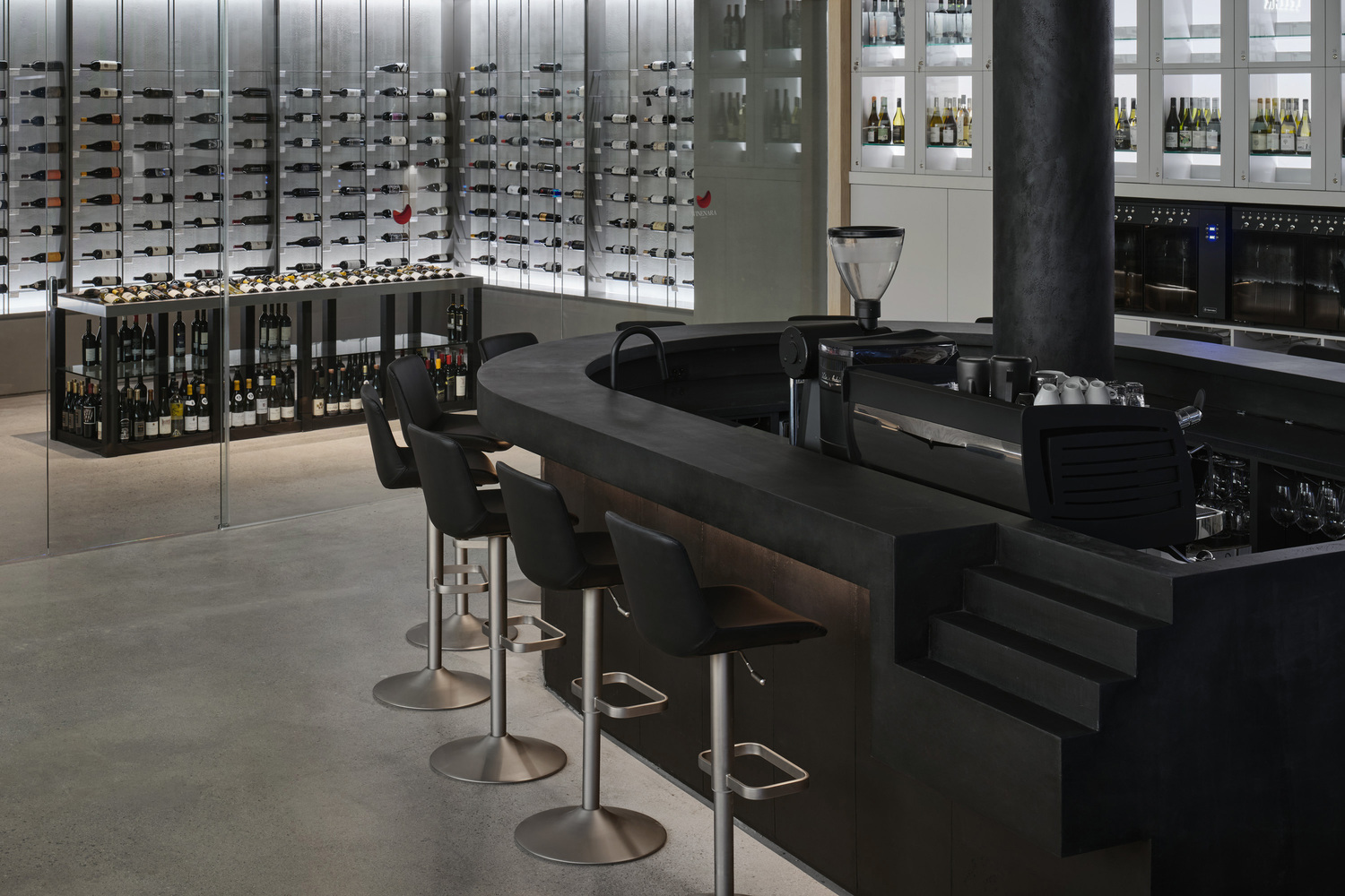 At the heart of the store lies a striking circular bar, a central focal point designed for social interaction and communal enjoyment. Clad in textured black concrete, the bar exudes a bold yet inviting aesthetic, encouraging visitors to engage in conversations and shared tastings. The layout further enhances the experience with a glass-doored wine refrigerator that subtly guides movement through the space. A short staircase introduces varying perspectives, promoting exploration and discovery within the store.