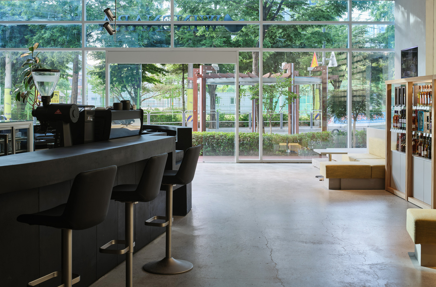 The store’s interior extends into a vast wine cellar, showcasing a premium collection of wines in various formats. Natural materials such as wood, fabric, and concrete create a warm and inviting ambiance, while large windows introduce greenery, blending the indoor environment with the vibrant energy of Seongsu.